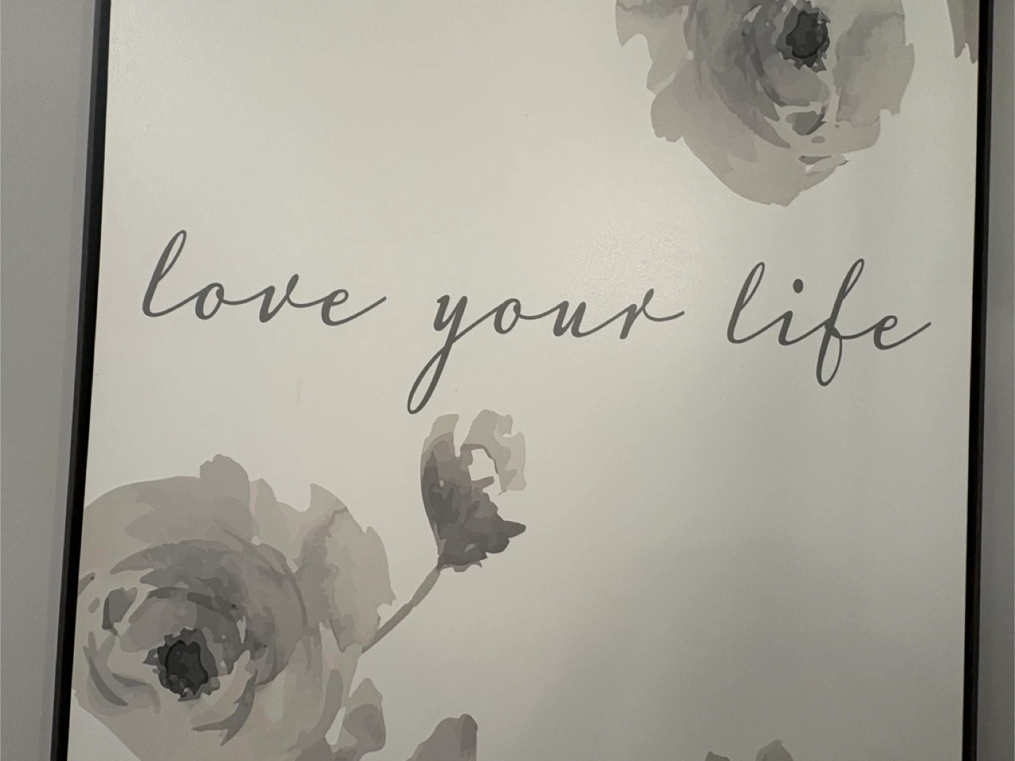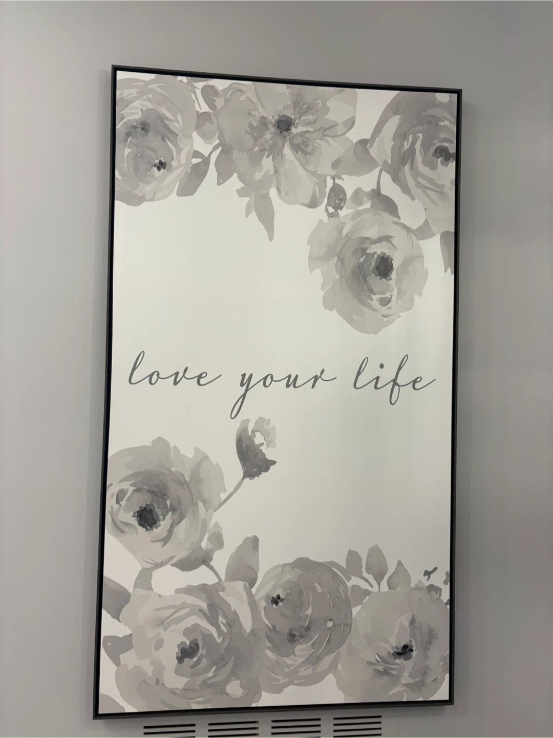 A beautiful large piece of wall art featuring a floral design and the words 'love your life'. It's in great condition and would be a lovely addition to any room