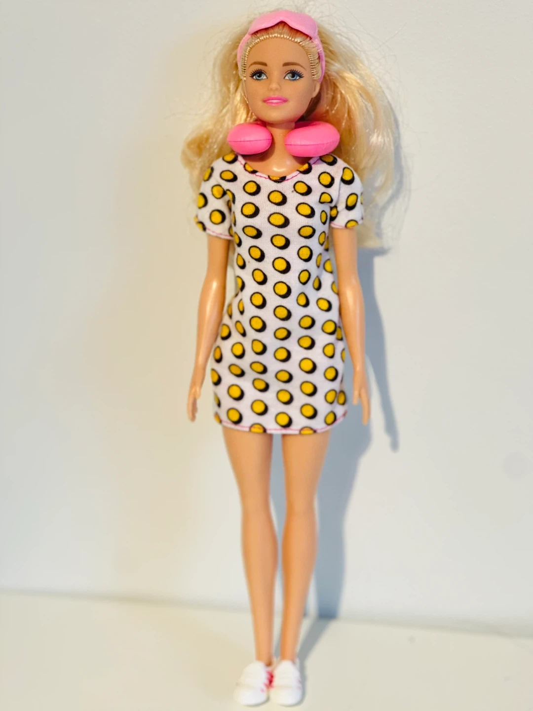 Here's a Barbie doll ready for a good night's sleep! She comes with a cute sleep mask and neck pillow. Her dress has a fun yellow polka dot pattern on a white background. She's wearing white sneakers too!