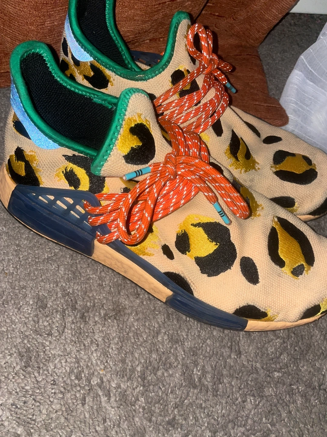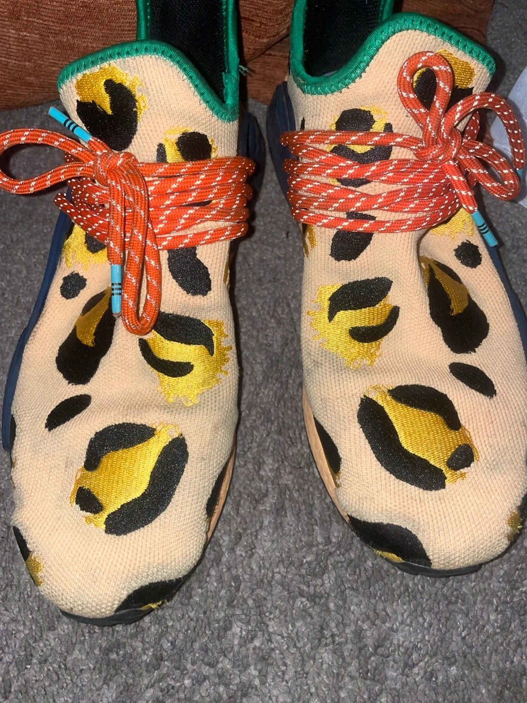 10Selling a pair of Adidas Pharrell Williams Human Race sneakers with a unique animal print design! These shoes feature vibrant colors and a comfortable fit. The design includes a combination of textures and patterns that make them stand out. Perfect for adding a bold touch to your style!