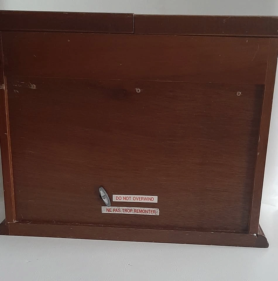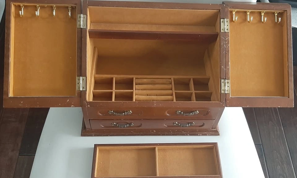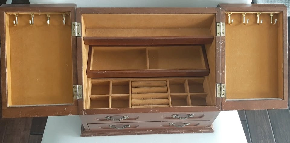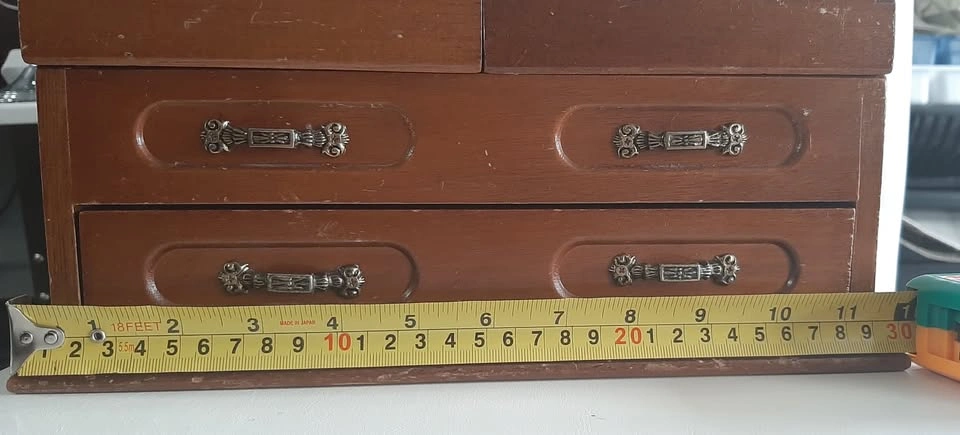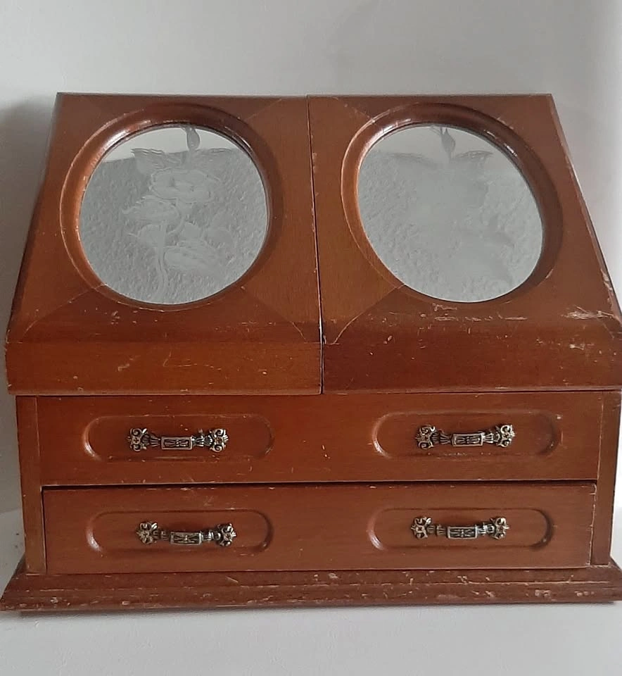 Wooden musical jewellery box. Please note: the top drawer is stationary and the bottom drawer opens up as seen in the pictures. Inside, including the drawer, is felt lined.
