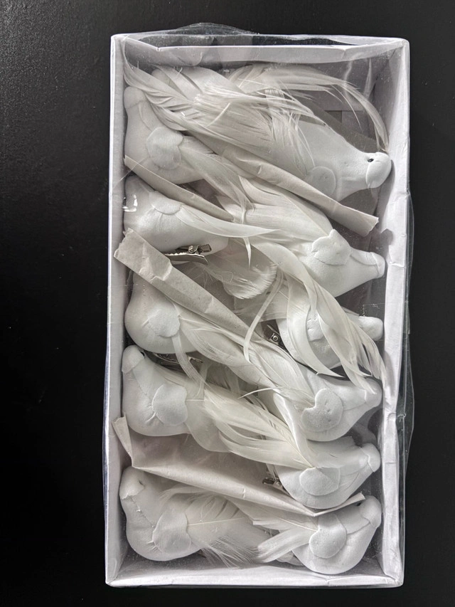 70Add a whimsical touch to your decorations with these 12 new white feather foam birds, each equipped with convenient clips for easy attachment. Perfect for crafts, floral arrangements, or adding a delicate accent to your home decor, these birds bring a touch of nature indoors. *2 UNITS IN STOCK* Specifications: * Quantity: 12 birds. 2 sets * Material: Feather, foam, and metal clips * Colour: White * Attachment: Clips Looking to add a little avian charm to your life? These feathered friends are just the ticket. And remember, if the ad is up, they're ready to fly to a new home! Pickup in Brampton near Sheridan College Davis campus