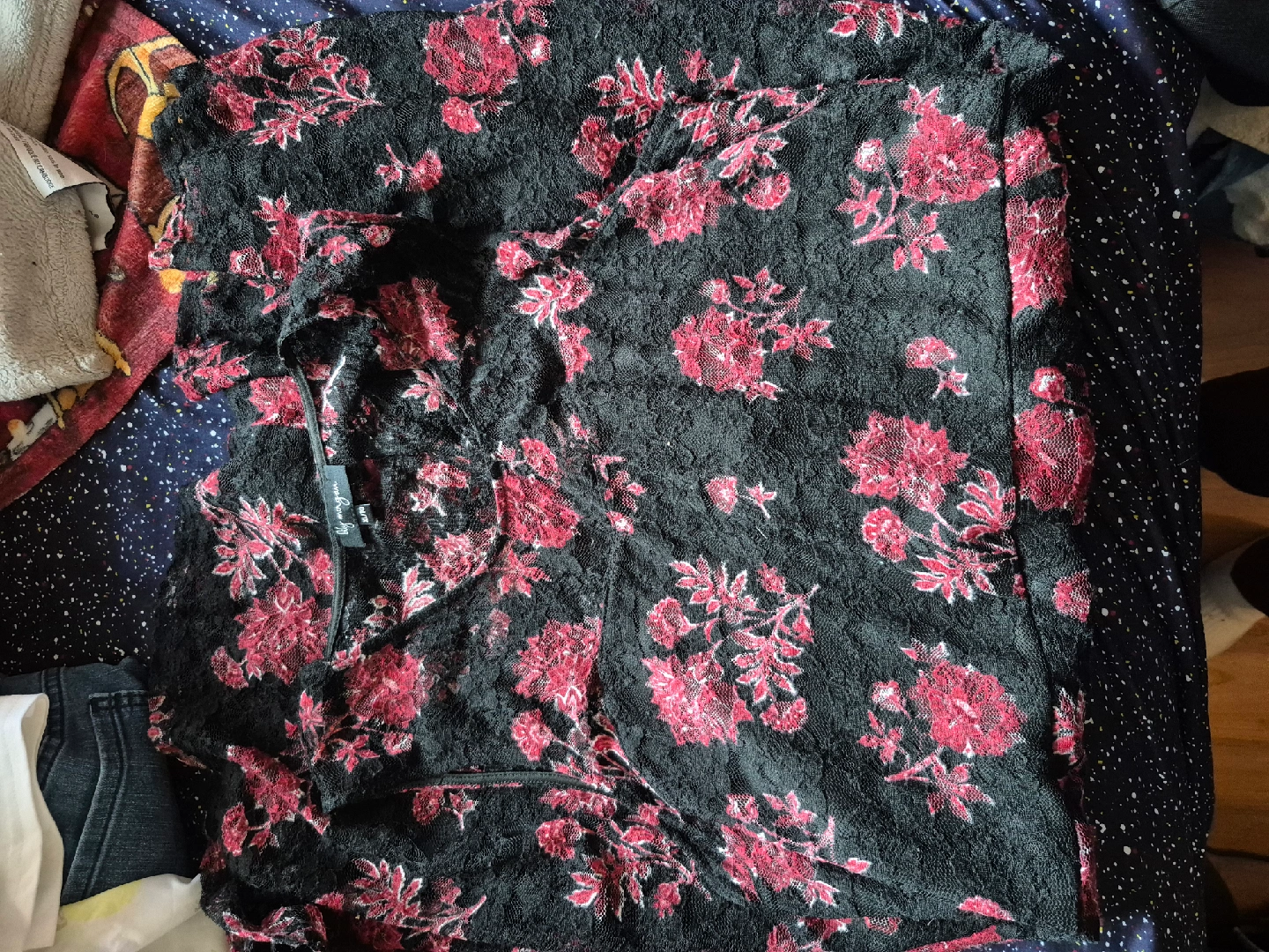 25Selling a Lily Morgan dress in size XL. It features a beautiful black lace overlay with a red floral pattern. Perfect for a night out or a special occasion!