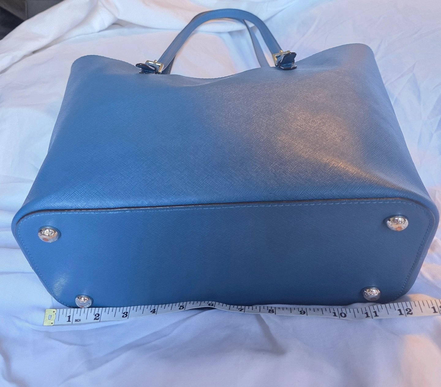 10Chic and versatile tote by Michael Kors, crafted of Saffiano leather. Features a sleek design with a spacious interior divided by a middle zipper compartment as well a a front pocket with credit card slots. Perfect to use as an everyday tote bag. Well loved for a number of years as a work bag. Please look at photos for the condition of the bag. Scratches can be seen in each of the four bottom feet. Other than that, bag is in very good condition.