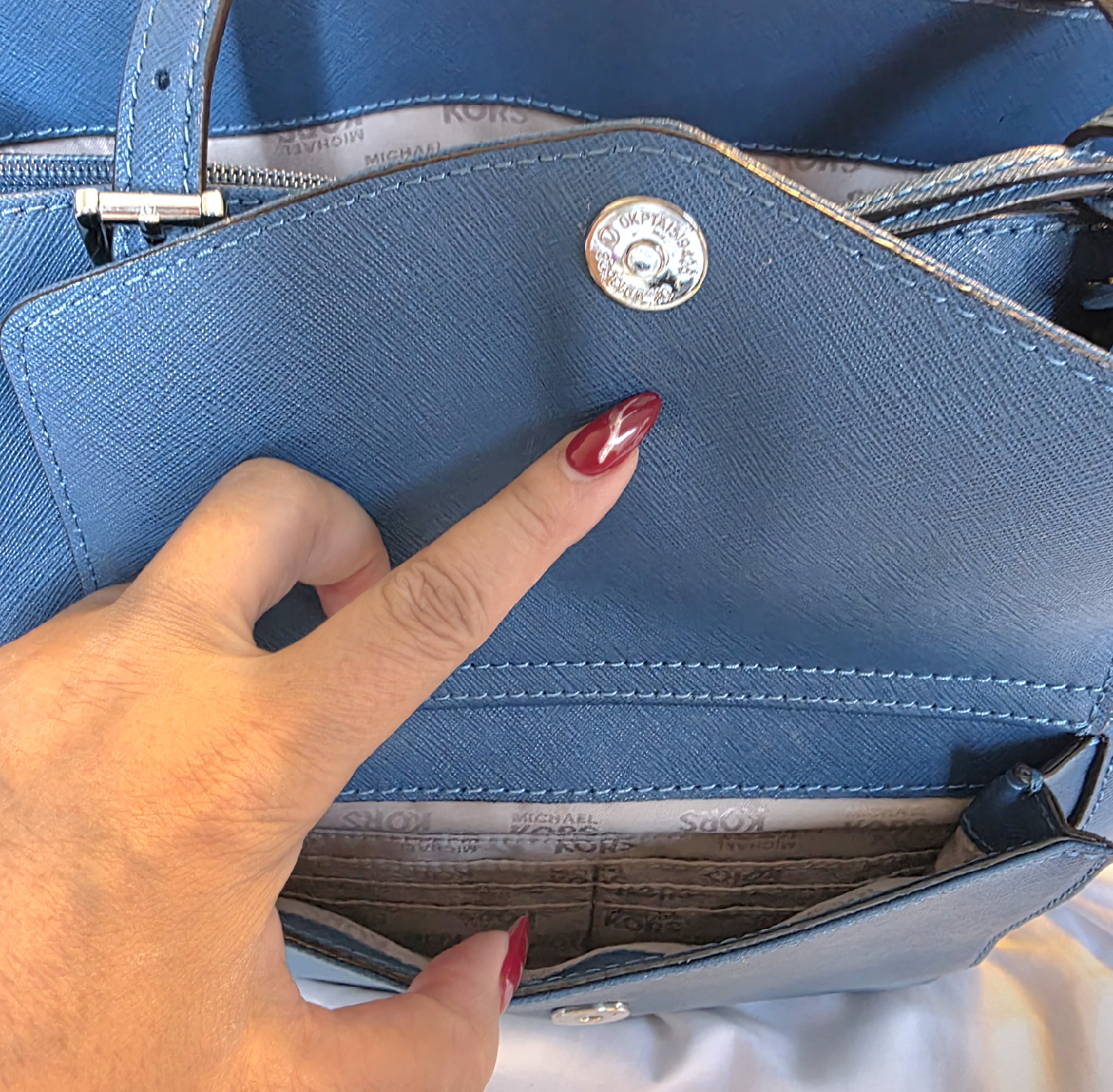 Features a sleek design with a spacious interior divided by a middle zipper compartment as well a a front pocket with credit card slots.