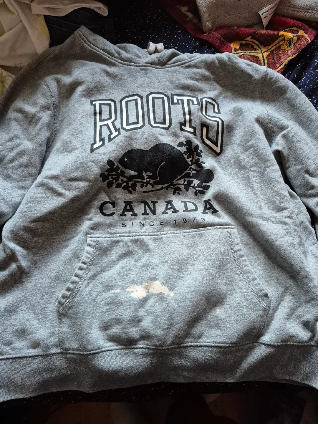 Selling a comfy Roots Canada hoodie! It's a size large and features the classic Roots logo. There's a bit of staining on the front pocket, but otherwise it's in good condition and ready for a new home
