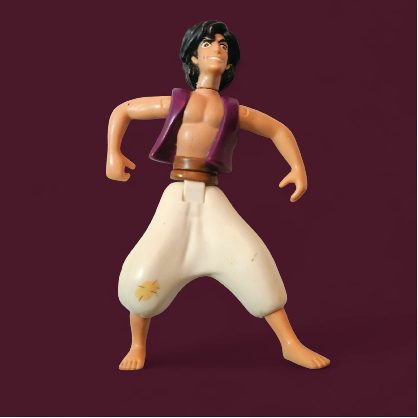 Selling an Aladdin action figure. It features Aladdin in his signature outfit. He has a purple vest and white pants. There is a patch on his pants.