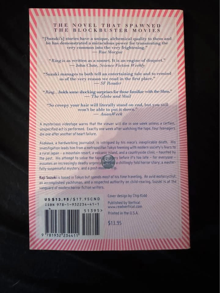 93Ring by Kōji Suzuki. A race against time to unravel a lethal supernatural mystery. The story is set in modern-day Japan and follows Kazuyuki Asakawa, a hardworking journalist who is intrigued by the simultaneous, mysterious deaths of four teenagers—one of whom is his niece. All four died of acute heart failure with an expression of profound terror frozen on their faces. Asakawa's investigation leads him to a secluded mountain resort where the teenagers had stayed exactly one week before their deaths. There, in the cabin they shared, he finds a mysterious, unmarked videotape. Upon watching the tape, Asakawa sees a series of strange, unsettling, and abstract images that culminate in a chilling warning: "You, who watched this tape, are going to die in one week from now." When the seven-day countdown begins for Asakawa, the journalist is thrust into a desperate race against time. He enlists the help of his skeptical, scientifically-minded friend, Ryūji Takayama, a university philosophy professor. Together, they must solve the puzzle of the cursed tape—which they discover is linked to the vengeful spirit of a psychic named Sadako Yamamura—before Asakawa, and eventually his family, succumb to the lethal curse. The novel is a tense blend of mystery, paranormal horror, and psychological thriller, exploring themes of technology, contagious media, and the power of psychic will. It inspired the globally famous Japanese film of the same name and its subsequent Western remakes.