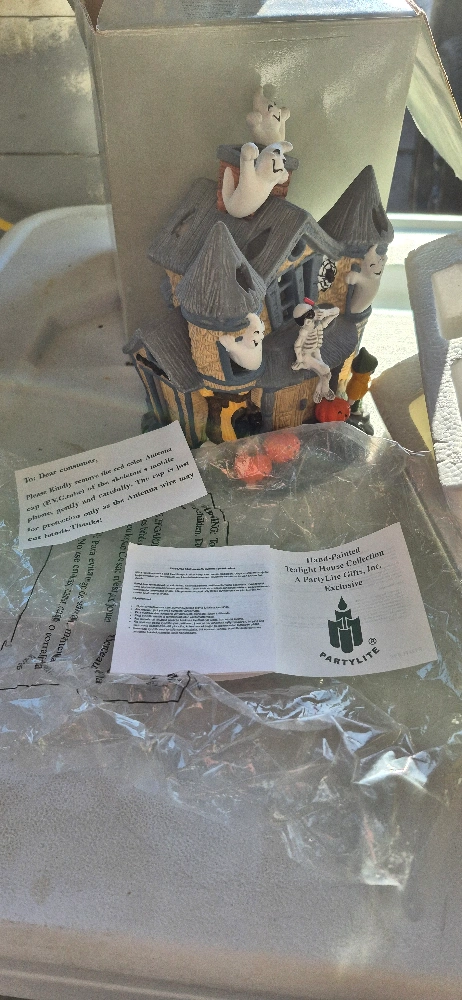 60Straight from my personal collection — I’m the original owner of this retired 2000 PartyLite Haunted House tealight holder. It has never been used or displayed, and still has the original plastic wrap, instruction cards, box, and styrofoam inserts. 🕯️ Details: Authentic 2000 PartyLite release (retired) Mint condition – still factory wrapped! Original box (top flap torn – see photo) Full styrofoam inserts Both instruction cards included Sticker still intact on base No chips, cracks, or fading 💀 Fun fact: the box includes a note about removing a “red antenna” from the skeleton’s phone — that piece was only in the very first production run. PartyLite apparently got lazy and kept printing the same insert even after they stopped including it. So you get the note and a laugh — collector trivia gold. 😄 💰 $70 firm