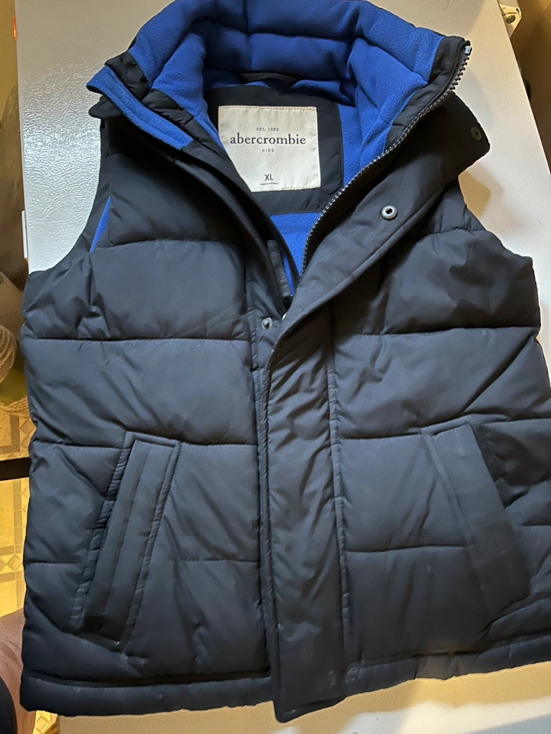 34Selling an Abercrombie Kids puffer vest in size XL! It's black with a blue fleece lining. Perfect for layering on chilly days!
