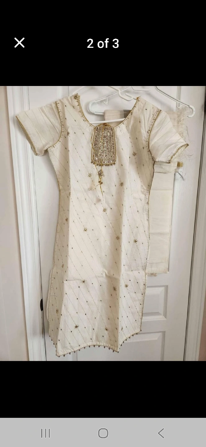 10Selling a beautiful cream-coloured salwar kameez suit. This elegant outfit is perfect for special occasions or festive gatherings. It features delicate detailing and a comfortable fit. The set includes the kameez (top), salwar (bottoms), and a matching dupatta. A lovely addition to any wardrobe!