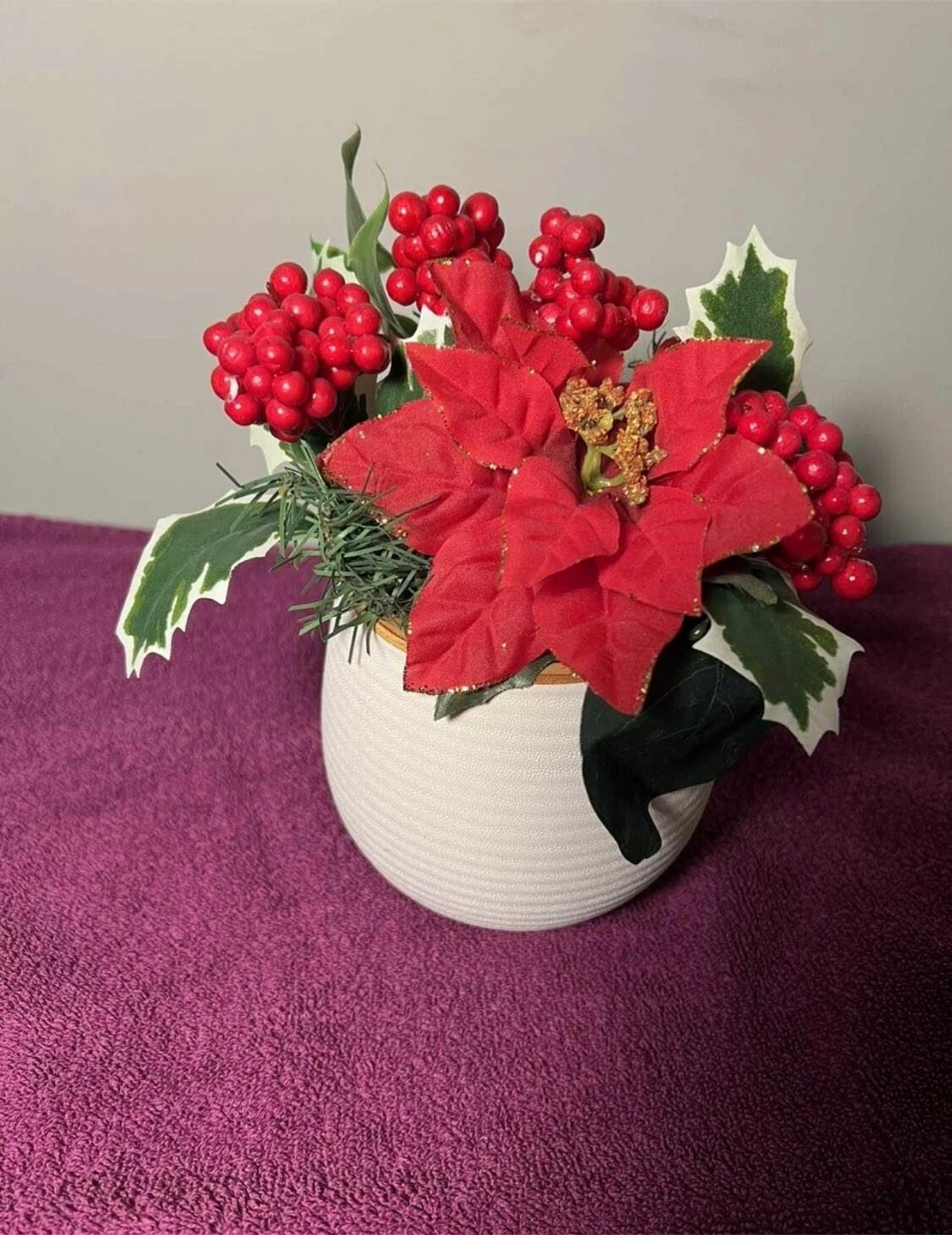 Handcrafted centerpiece great for decoration or gift giving! Vase is ceramic off white with gold trim on top. Approximately 5”x6”. Non Smoking, Pet friendly home. Cross Posted, No try-ons or returns (*Please see my page for more items)