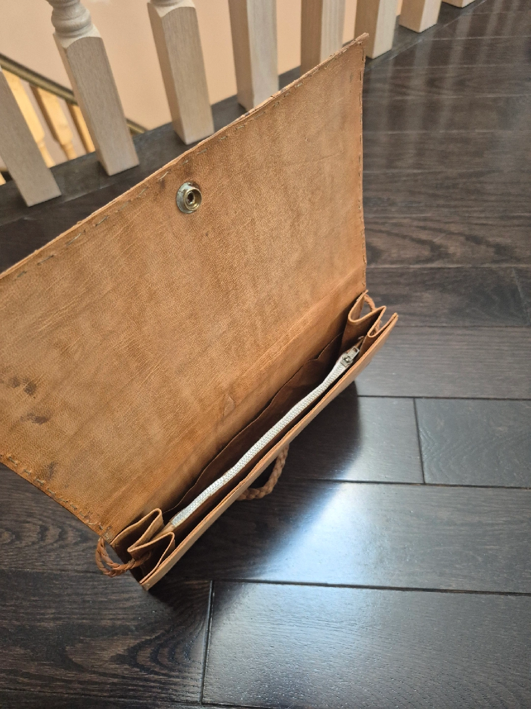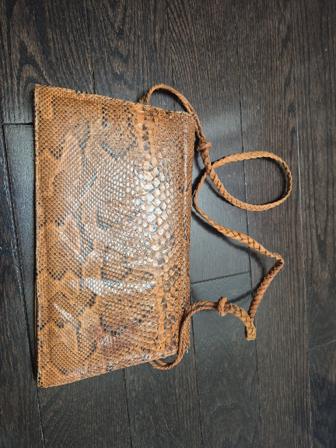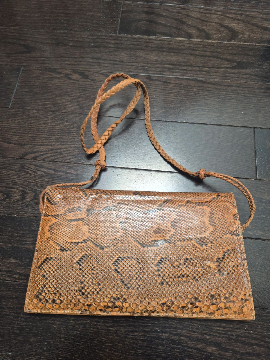Selling a real snakeskin shoulder bag. It features a leather braided shoulder strap and a snap closure. The interior has a zippered compartment. This antique vintage piece belonged to my grandmother and has never been used.