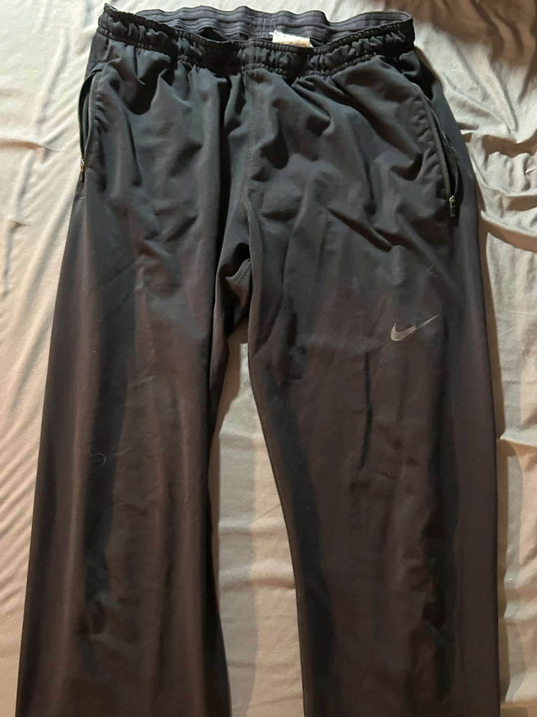 Selling a pair of black Nike track pants. They feature a comfortable elastic waistband and convenient zippered pockets. Perfect for workouts or casual wear!