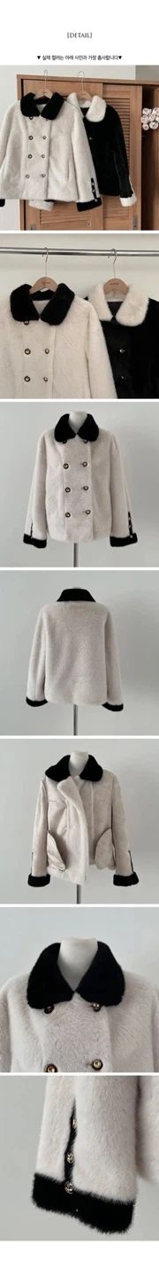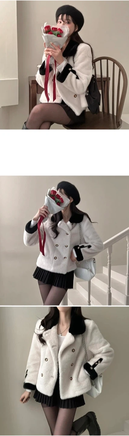 Here's a stylish white fleece jacket with black trim! It features a double-breasted design with gold buttons and a contrasting black collar and cuffs. Perfect for adding a touch of elegance to your wardrobe!