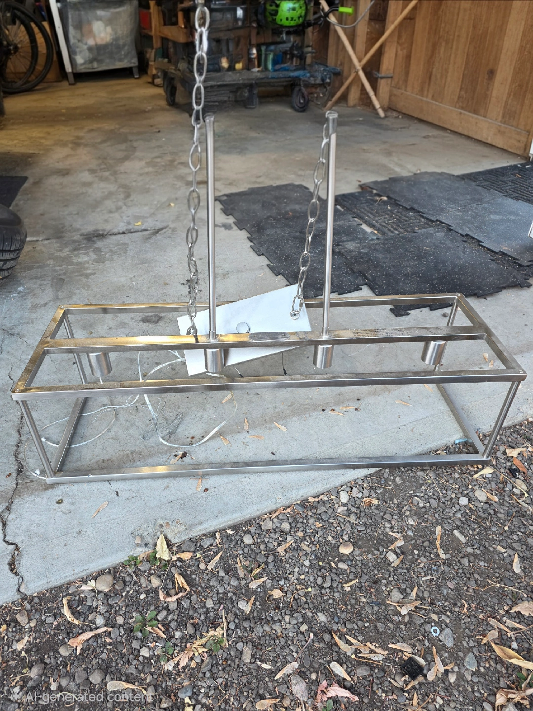 Selling a modern pendant light fixture! It features a stainless steel frame with a rectangular design and chain supports. It would be a great addition to any dining room or kitchen!