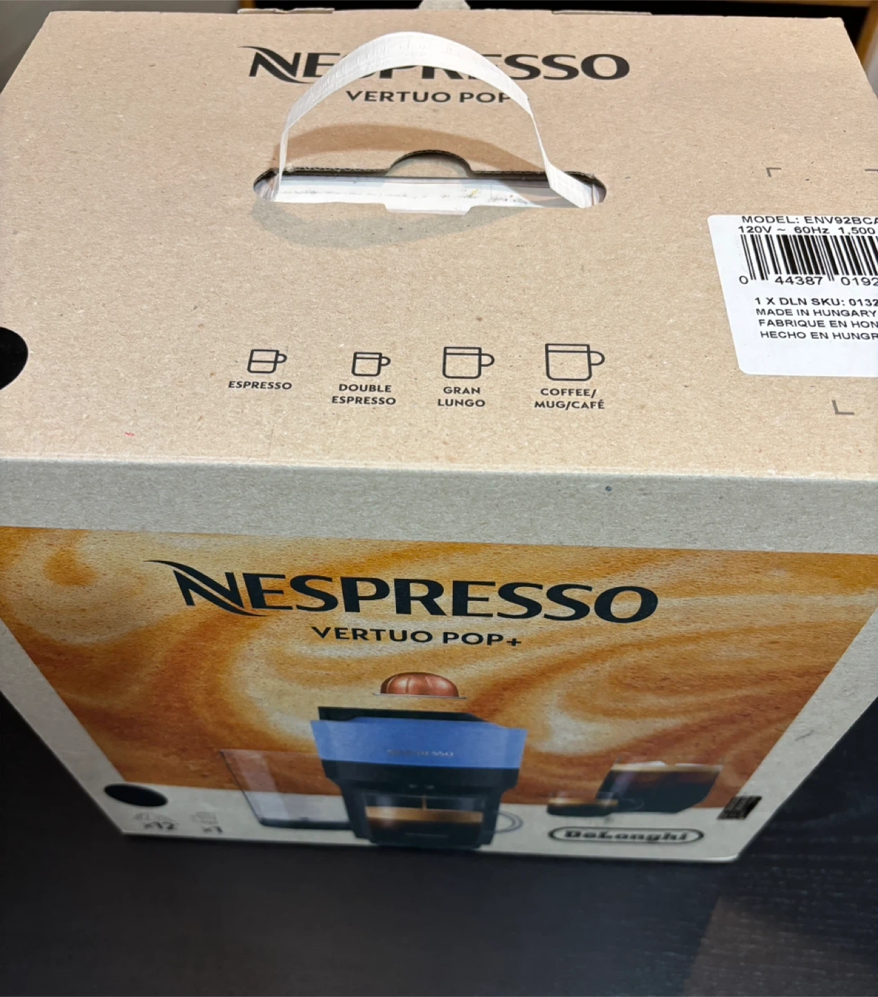 Selling a brand new Nespresso Vertuo Pop+ coffee machine, still in its original box! This machine makes espresso, double espresso, gran lungo, and coffee/mug/café sizes. It's a DeLonghi model. Get ready to enjoy delicious coffee at home!