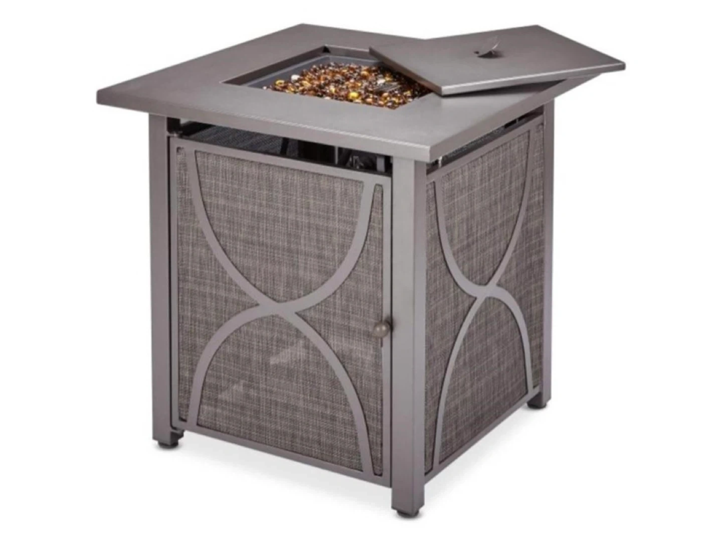 Here's a lovely square fire pit table, perfect for adding some warmth and ambiance to your outdoor space! It features a stylish design with a mesh-like door and a convenient lid to cover the fire pit when not in use. The assembled one is gone already. I have one left new in box and needs assembly. Surprisingly easy to assemble. 8 screws is all.