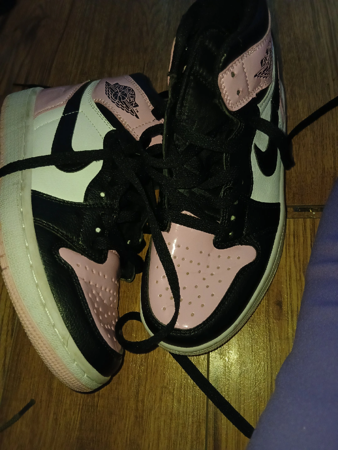 Selling a pair of Nike Air Jordan 1 High sneakers in a pink and black colourway. They show some signs of wear, but still have lots of life left in them!