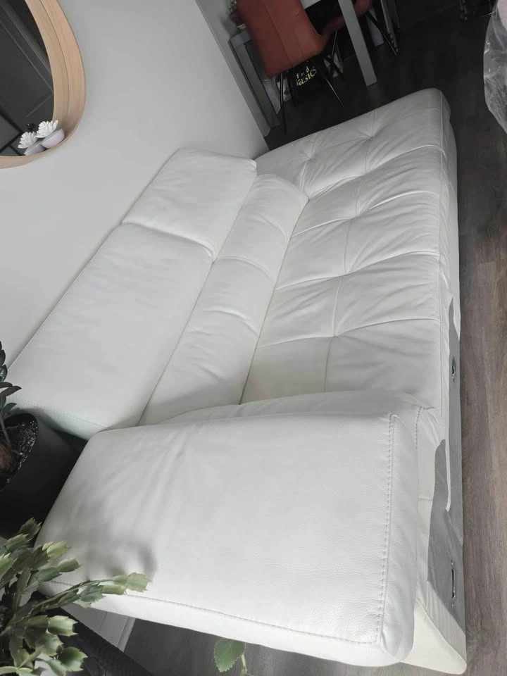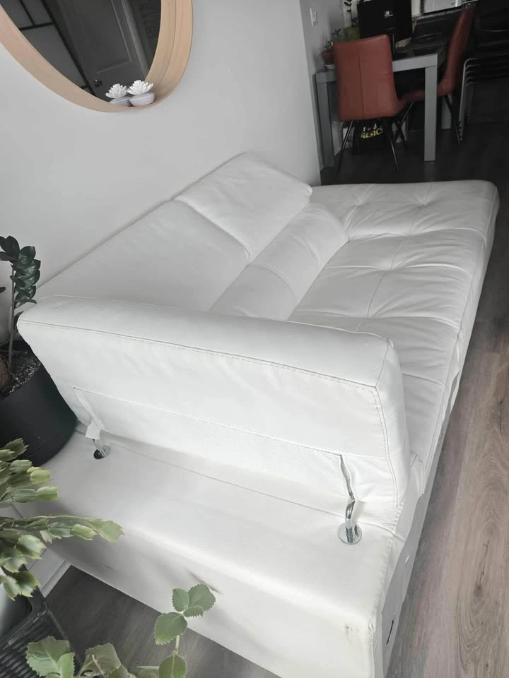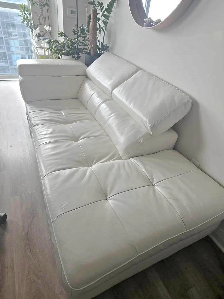 This stylish white leather couch, with dimensions of 86 inches in length, 34 inches in width, and 30 inches in height, is a fantastic addition to any living space. The couch is used and shows minor signs of wear, but it remains both comfortable and visually appealing.
