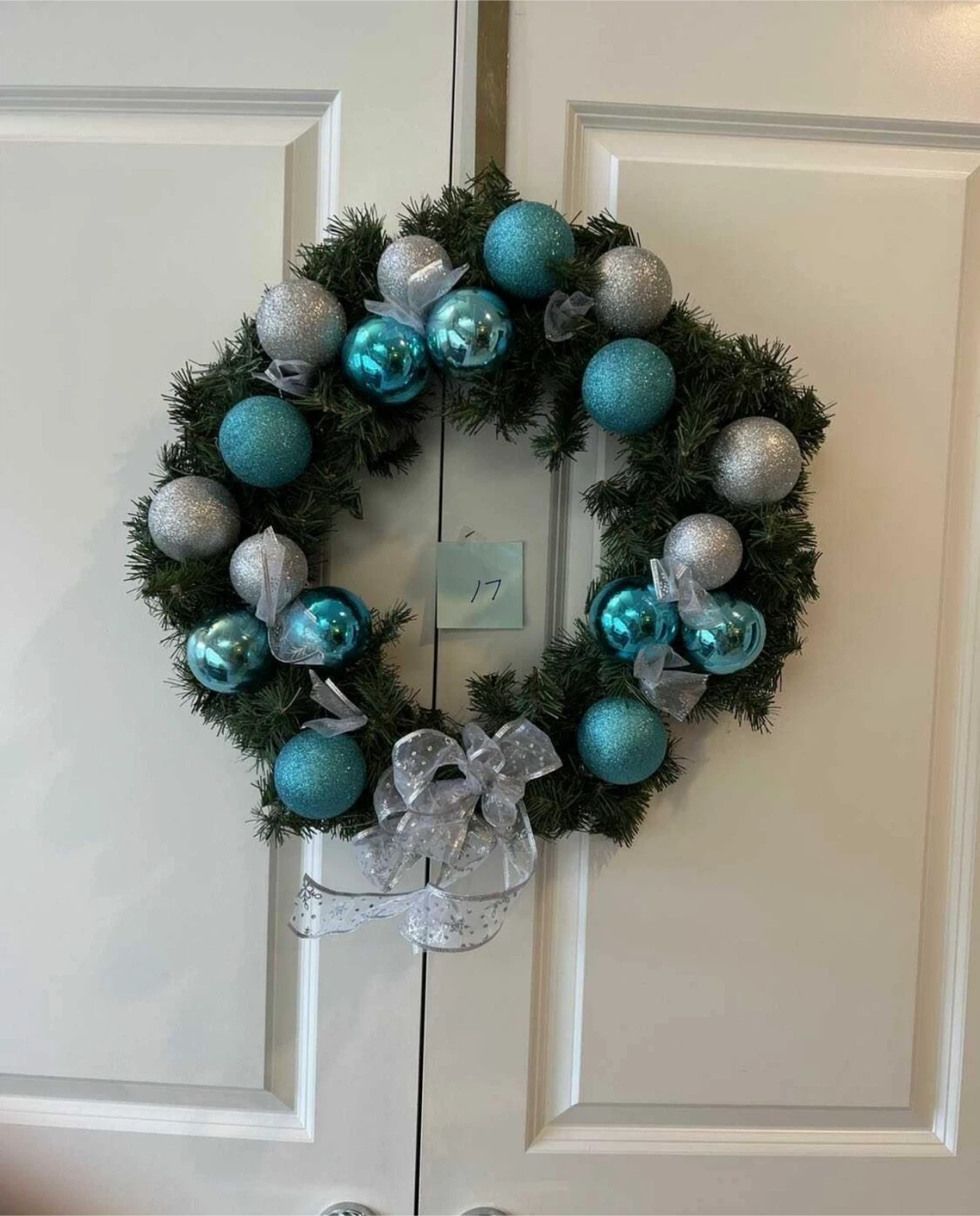 Handmade blue and silver holiday wreath, approximately 21” in diameter Hanger not included Non Smoking, Pet friendly home. (Numbers are for seller’s purpose) Cross Posted, No returns (*Please see my page for other items and/or designs. Thanks!😊)