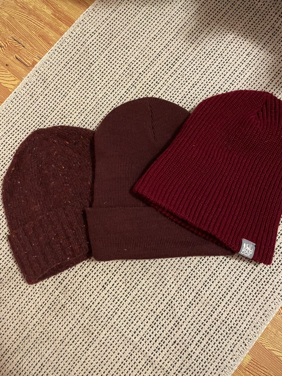 Selling a set of 3 beanies in different shades of maroon/burgundy.