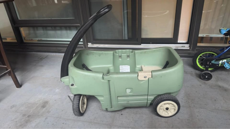 Dimensions 42.5D x 20.3W x 38.3H Centimetres. Brand Step2. Material Plastic. Colour green. Special feature Compact, Portable. Number of shelves 1. Easy-latch door makes it simple for a toddler or preschooler to get in and out of the wagon, while remaining secure in this kid’s wagon when it is moving. Two contoured seats and deep leg. Weight capacity: 100 lbs. Two seat belts help keep children secure in their seat. Fold under handle for easy transport and storage. Large 8" (20.3 cm) wheels with plastic tread provide children a fun wagon ride