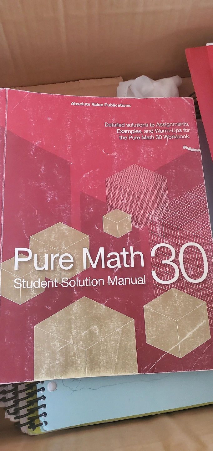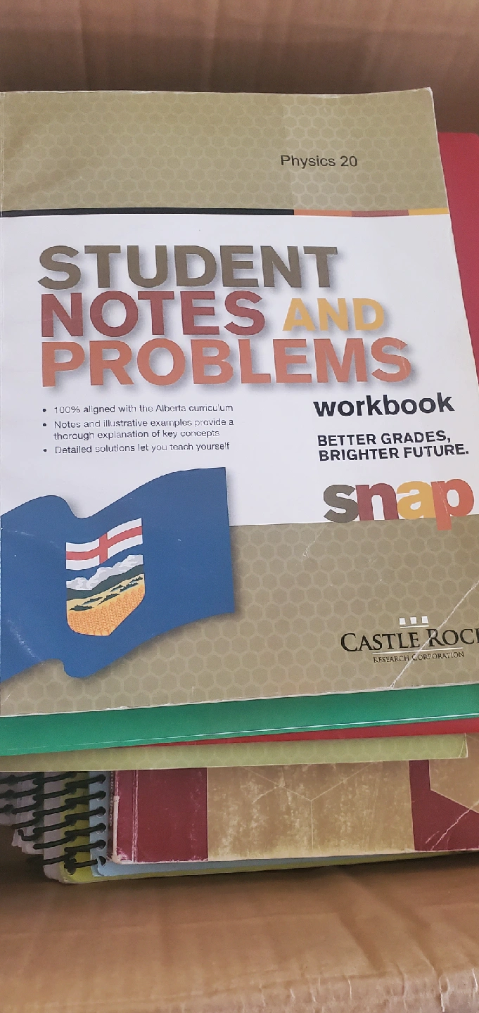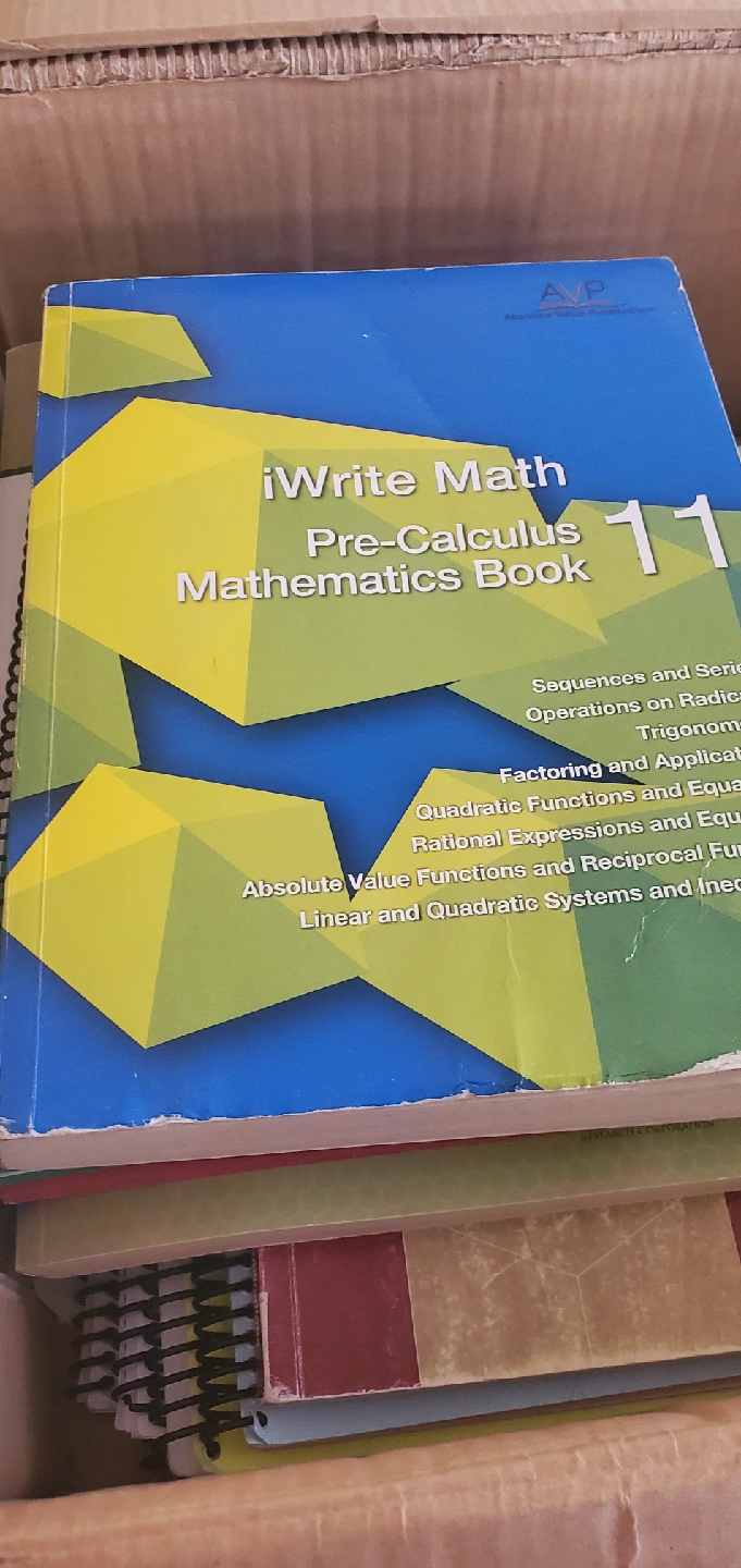 Selling a collection of high school workbooks including Pure Math 30 Student Solution Manual by Absolute Value Publications, Physics 20 Student Notes and Problems Workbook by Castle Rock Research Corporation, and iWrite Math Pre-Calculus Mathematics Book 11 by A.P. Publications