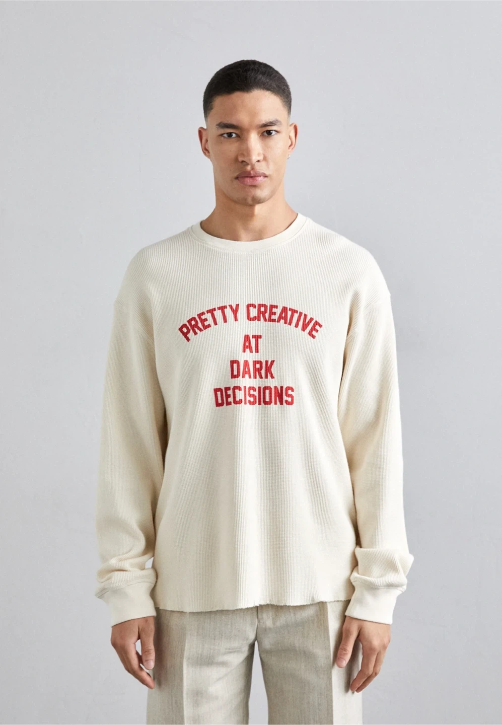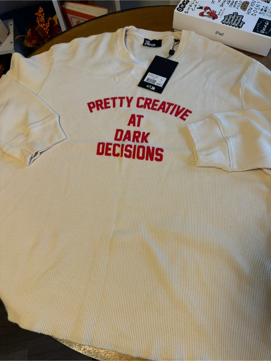 Brand new with tags. It's a size XL and features "Pretty Creative at Dark Decisions" print in red. The material is a soft cotton blend. MRSP $345.