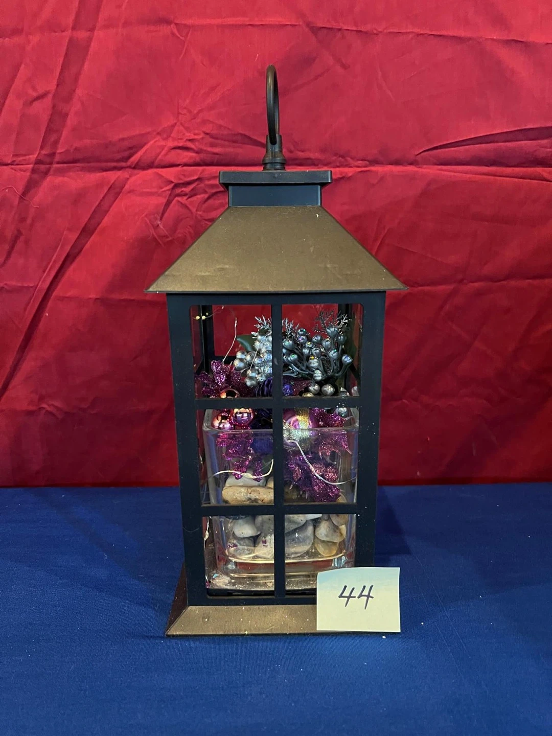Selling a decorative black metal lantern! It features a clear glass insert filled with decorative stones and purple floral accents. It does light up, but may require a new battery.