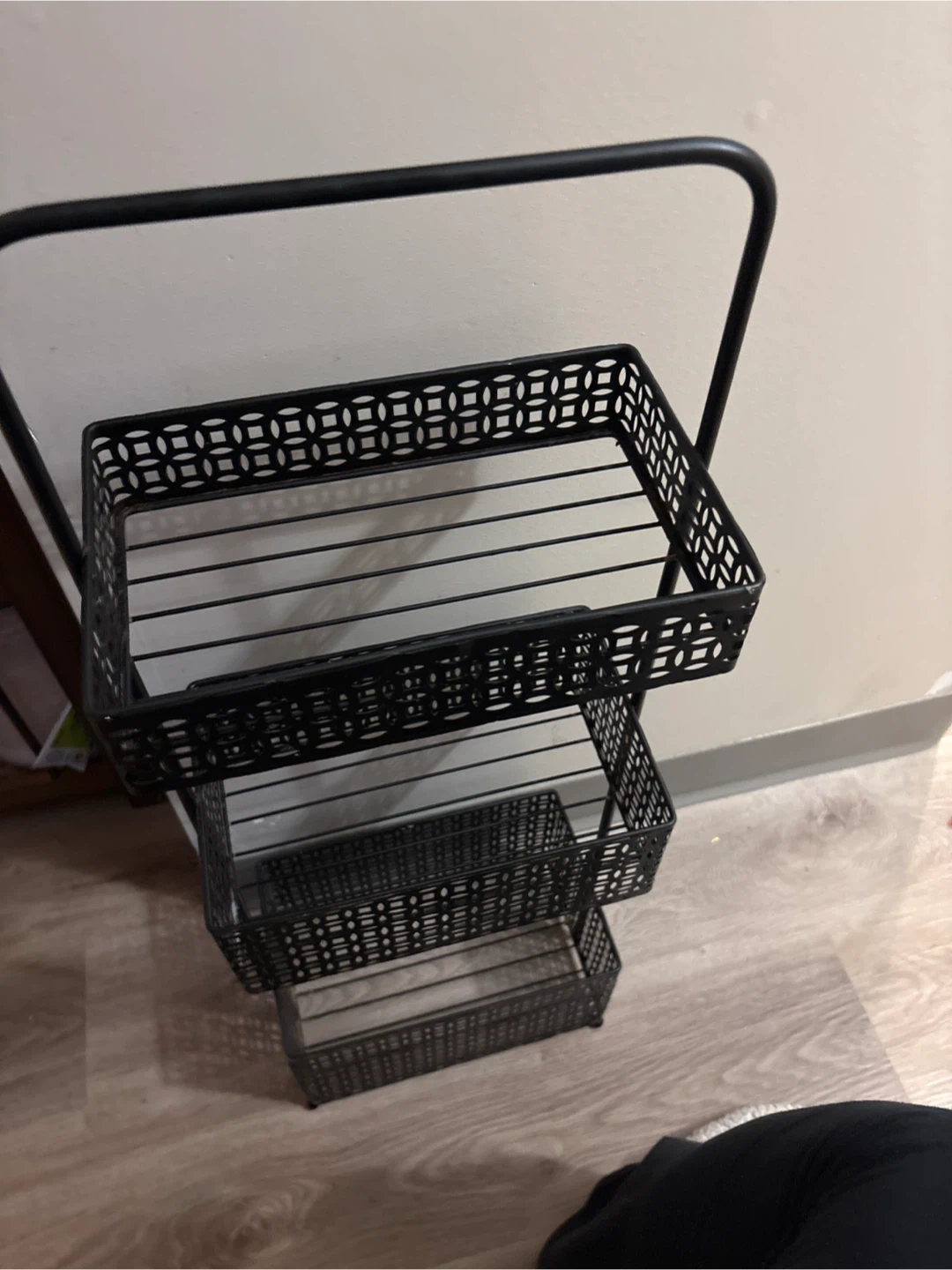 Here's a handy black metal storage rack with three tiers! It's perfect for organizing small items in your kitchen, bathroom, or any space where you need a little extra storage. The open design allows for easy access and visibility of your items