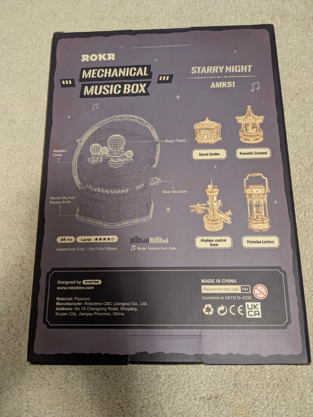 52Selling a ROKR Starry Night AMK51 mechanical music box. It's a beautiful piece with intricate details, including a gear structure and music box plays 'memory' from cats. The assembled size is 135x135x155mm with 84 pieces. Recommended for ages 14+. https://rokr.robotime.com/product/rokr-starry-night-amk51/ Available for pick up in front of food basics (intersection of Major Mackenzie and Bayview)