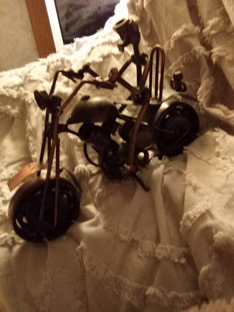 Cool metal motorcycle sculpture! It's a unique piece of art, perfect for adding a bit of character to any room. Would look great on a desk or shelf!