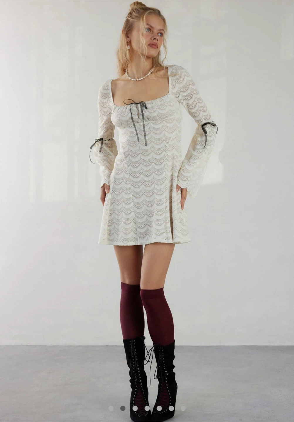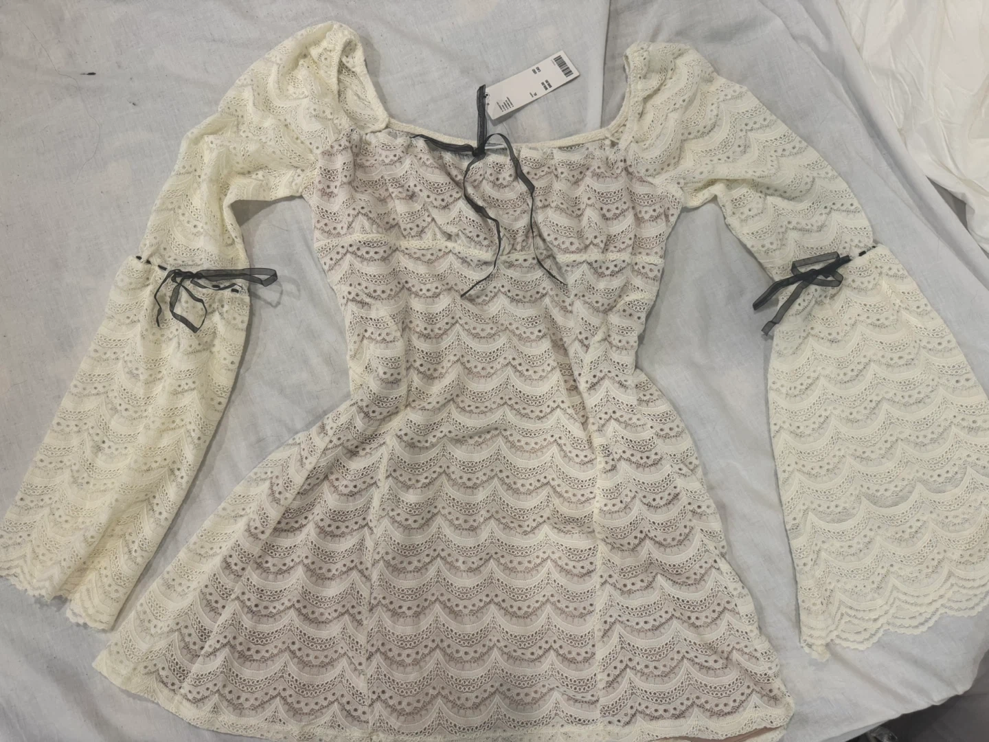 Selling a cute Urban Outfitters lace mini dress. It's a size XL and features a square neckline and bell sleeves with tie details. Perfect for a night out!
