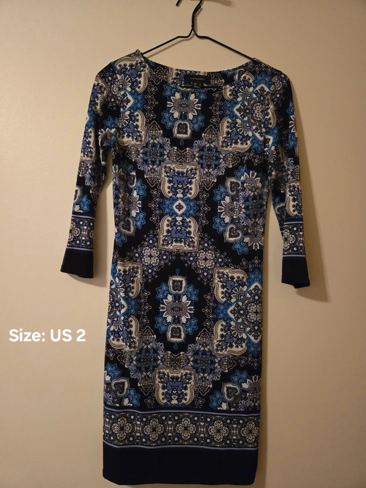 This is a cute Atmosphere dress in size US 2. It has a beautiful blue and black pattern that's perfect for any occasion. It's in great condition and ready for a new home