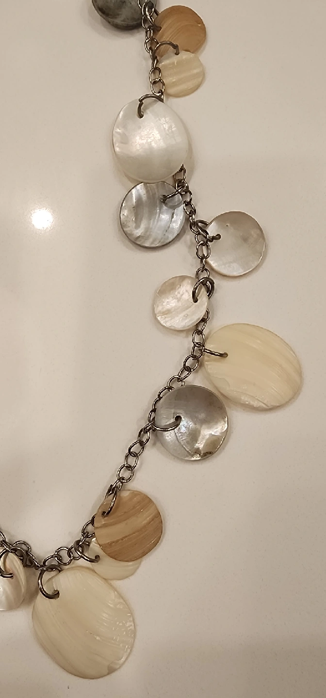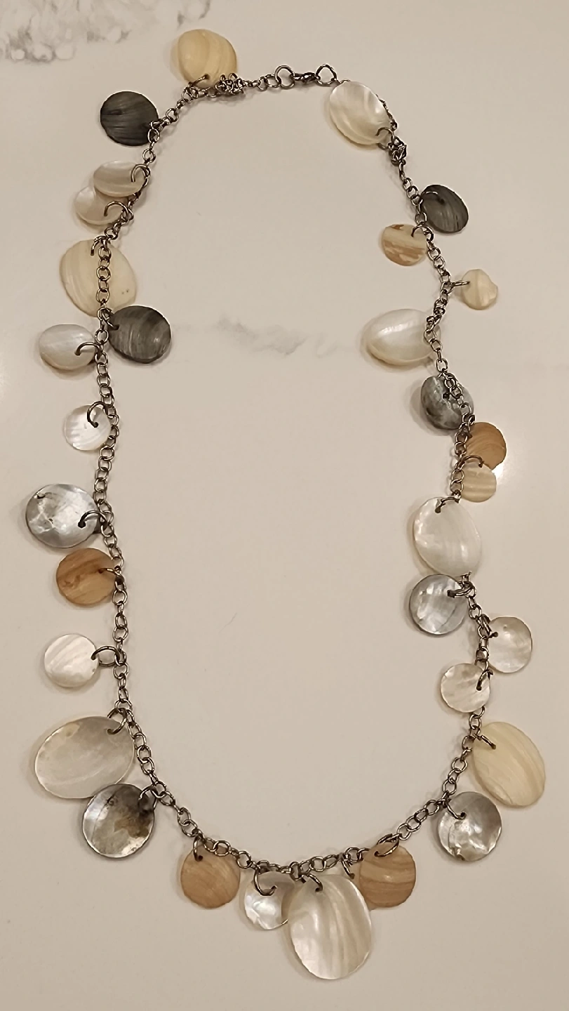 32This is a beautiful shell pendant necklace. It features a silver-tone chain with various shell pendants in neutral tones. It's in great condition and would be a lovely addition to any outfit When straightened, it is 29 inches long