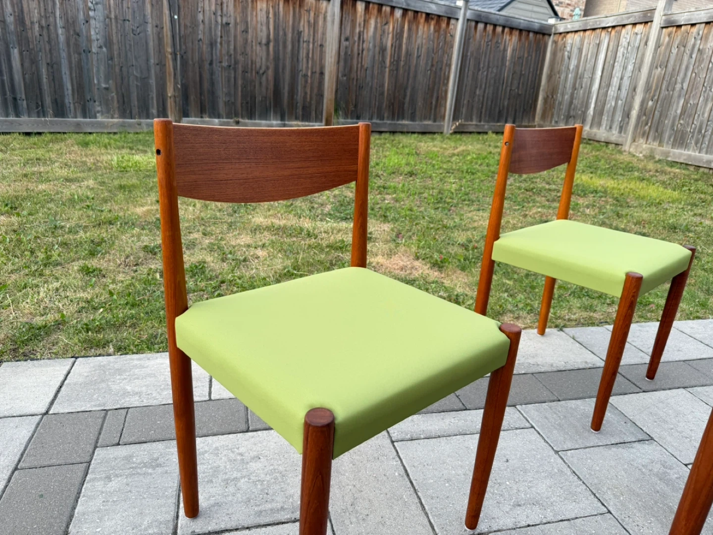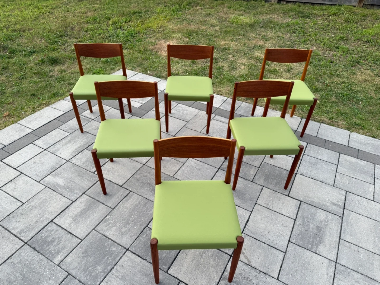 Here's a set of six vintage dining chairs! They feature a lovely teak frame and a comfortable green seat. These chairs would add a touch of mid-century modern style to any dining room. They are in great condition and ready for a new home Fully Restored