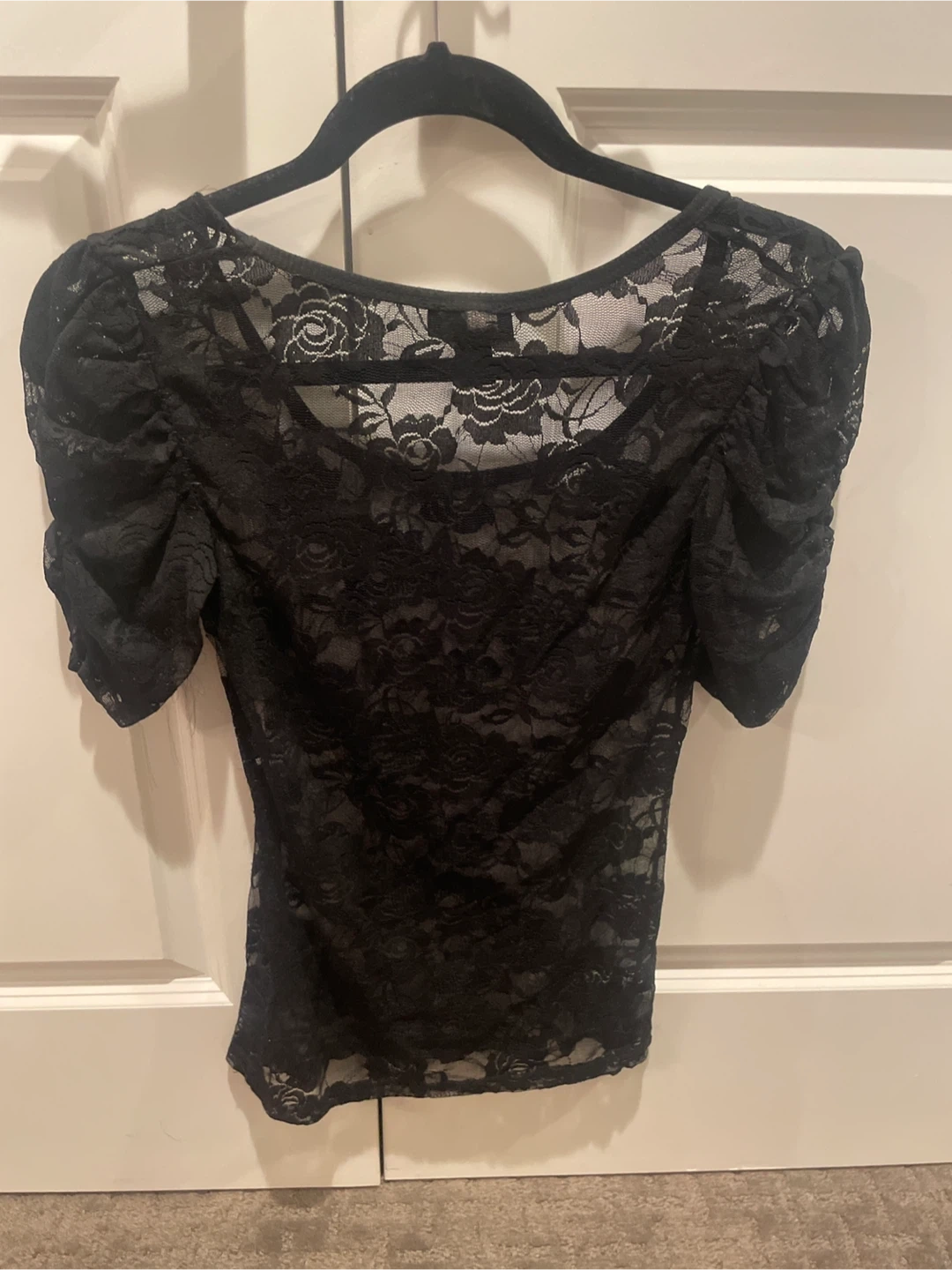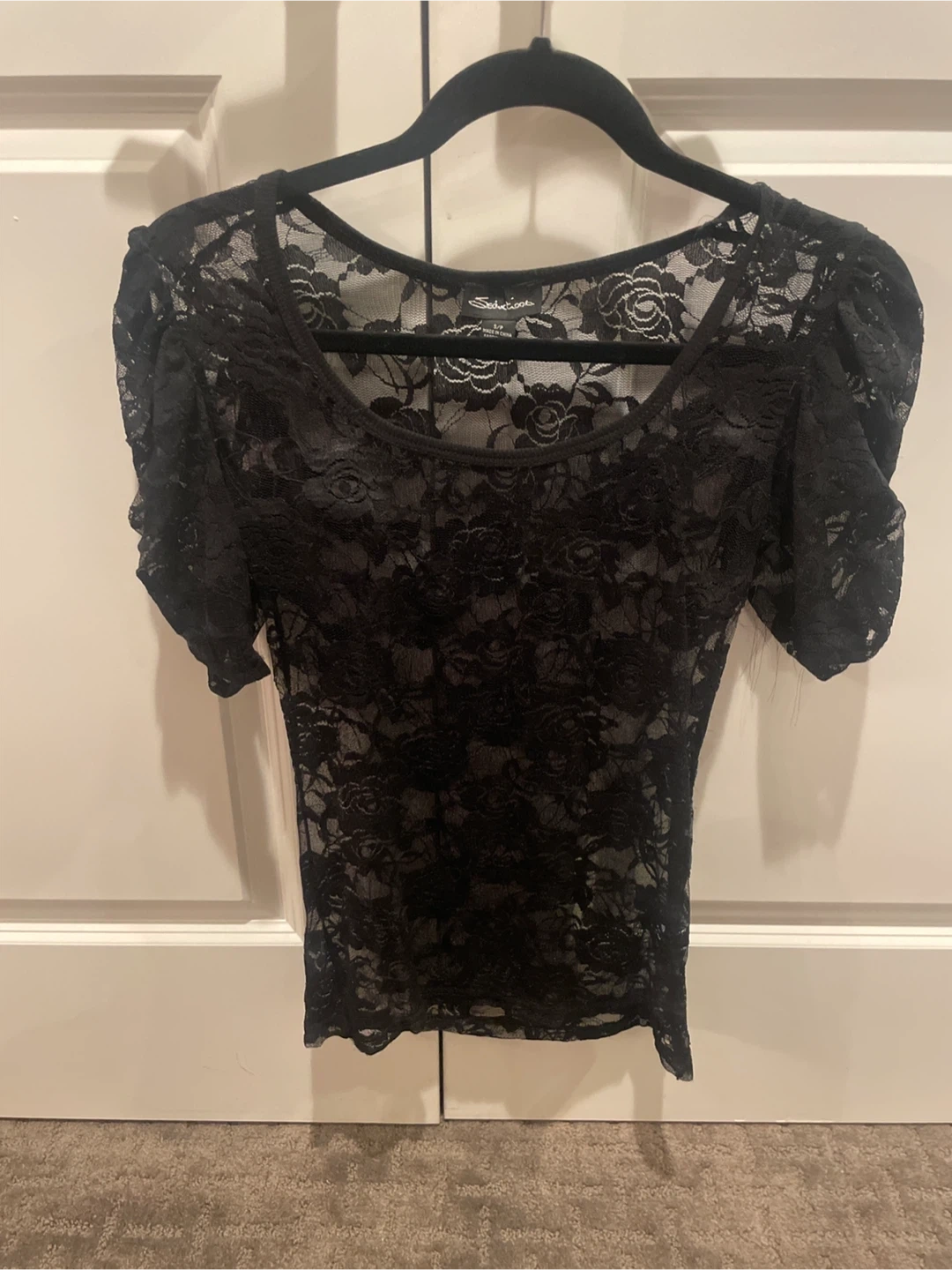 Selling a cute Sabrina black lace top in size small ! It's in great condition and perfect for layering or wearing on its own. The lace detailing is really pretty and adds a touch of elegance to any outfit