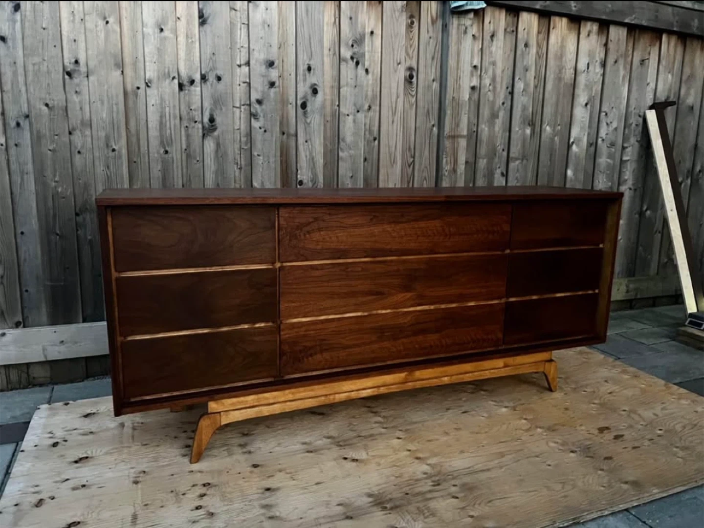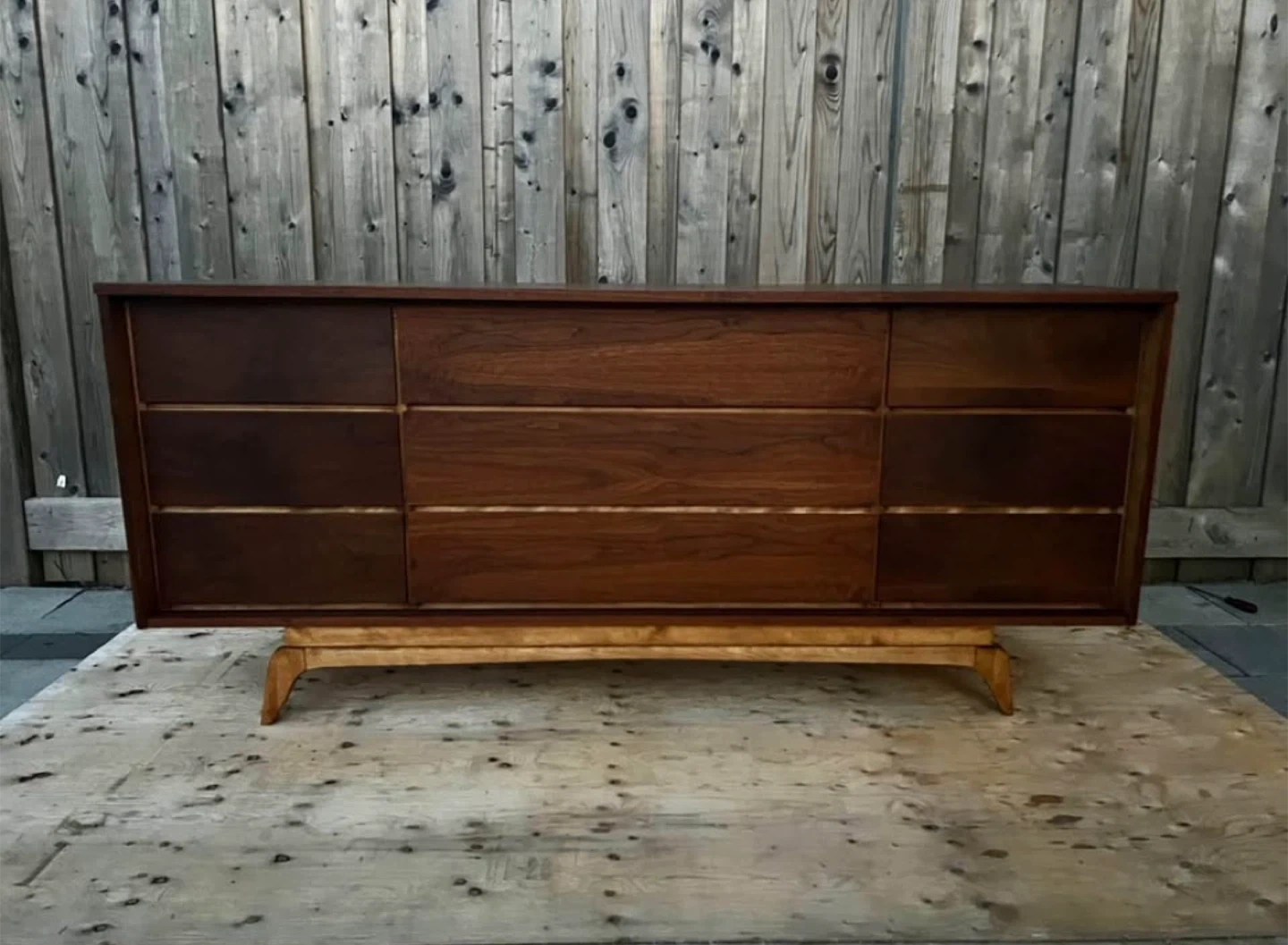 Beautiful Mcm Walnut dresser with plenty of storage! It features a rich, dark wood finish and a sturdy construction. This dresser would look great in any bedroom or living space