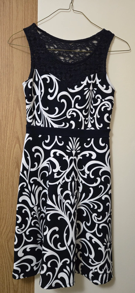 Selling a cute sleeveless dress with a blue and white pattern! The top part has a pretty lace detail. It's in great condition and would be perfect for a party or special occasion