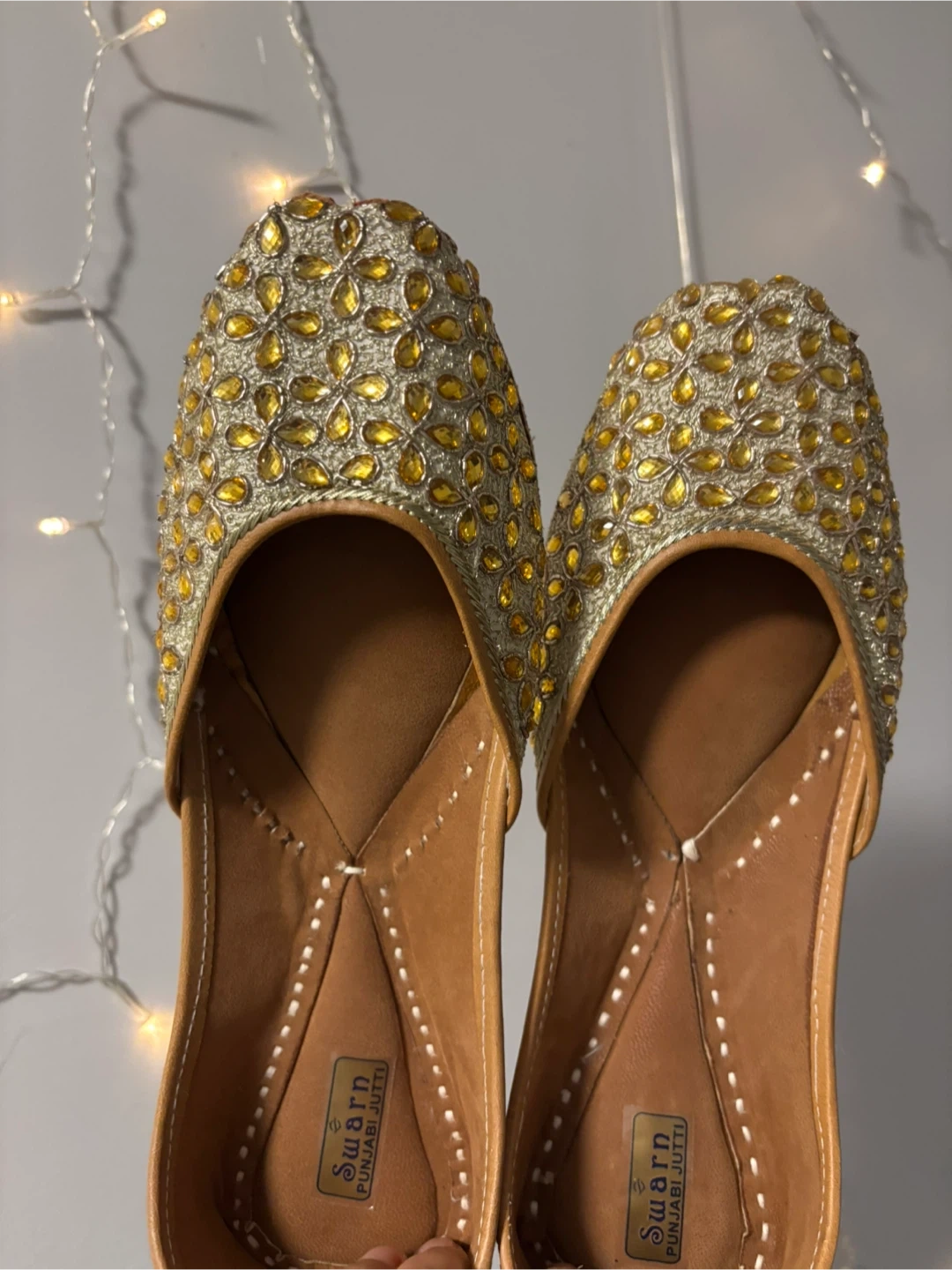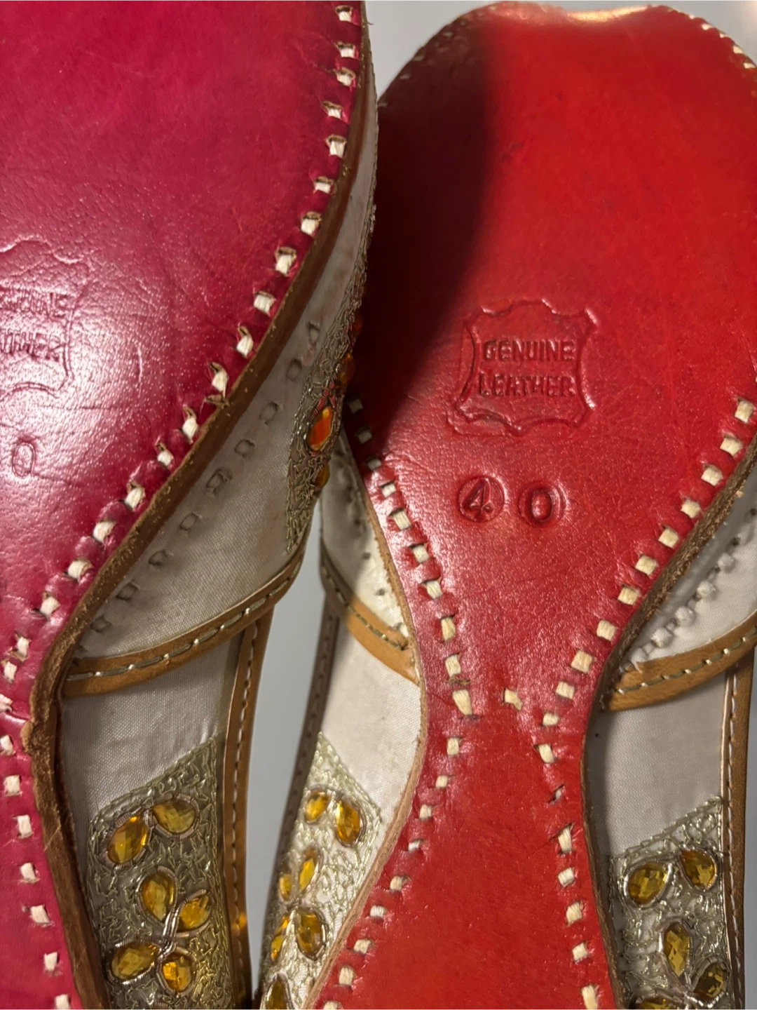 These are a beautiful pair of Punjabi Jutti in size 40. They feature gold embellishments and are made of genuine leather. Perfect for adding a touch of elegance to any outfit!