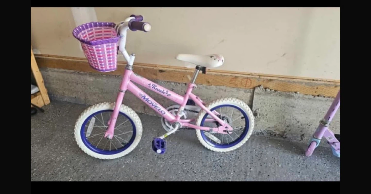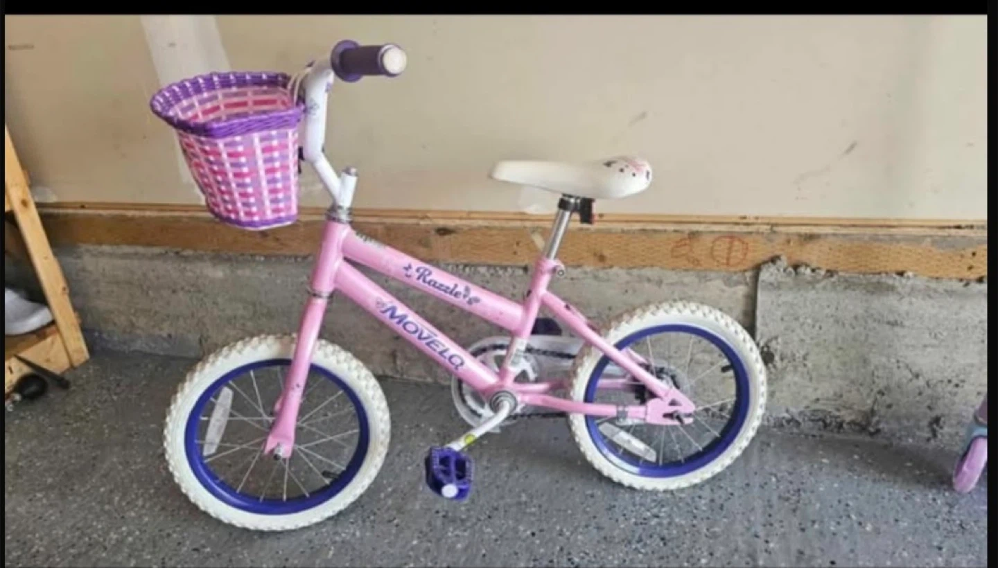 Selling a Movelo Razzle 16-inch kids' bike in pink! It's in good shape and ready for a new rider. However 1tire is flat.