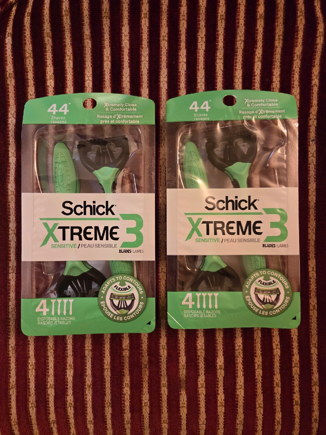 Two packs of Schick Xtreme 3 Sensitive disposable razors, each containing 4 razors. They are designed for an extremely close and comfortable shave and adapt to your contours with flexible blades. They're brand new and ready to go!