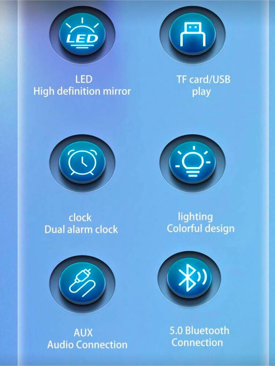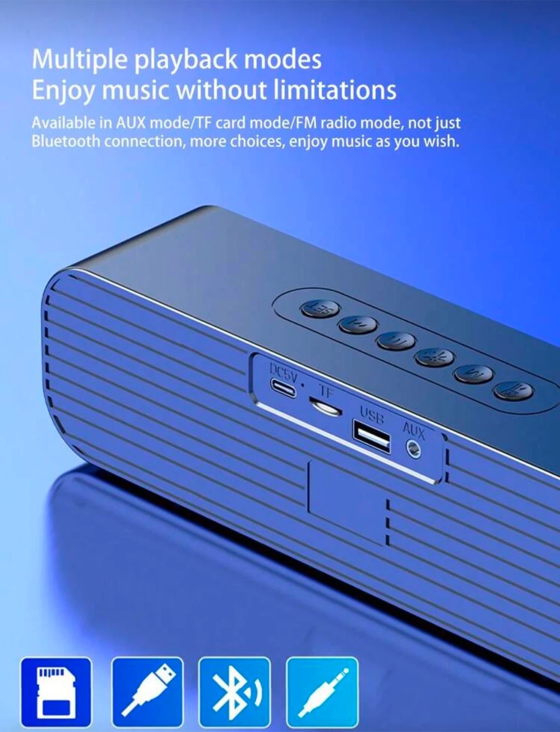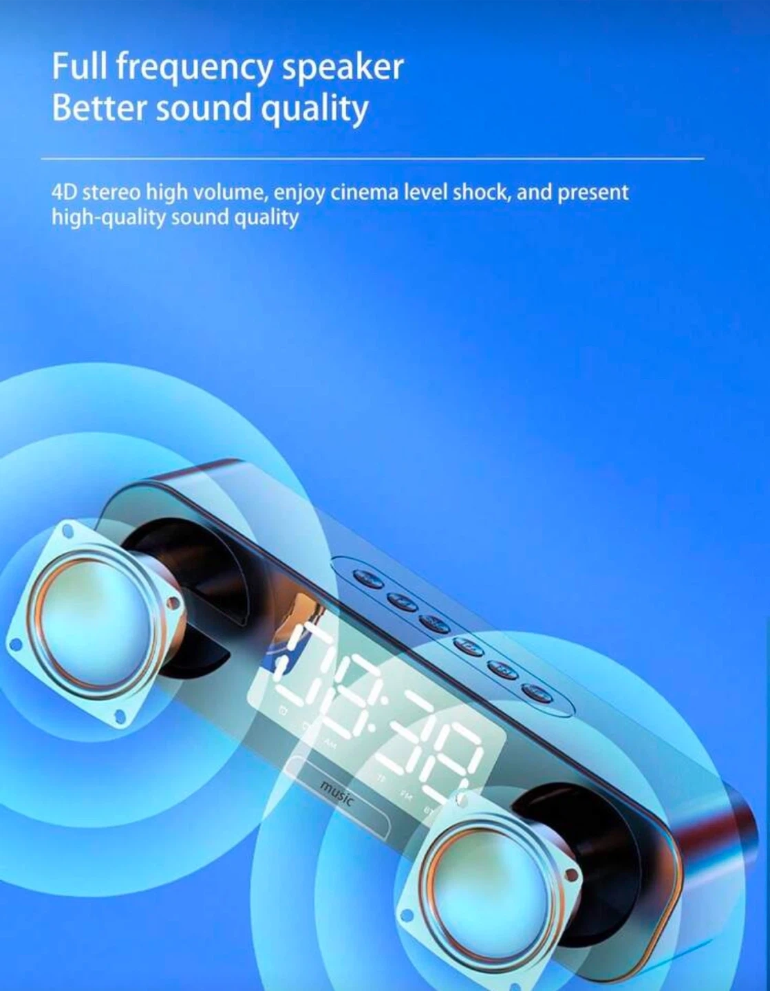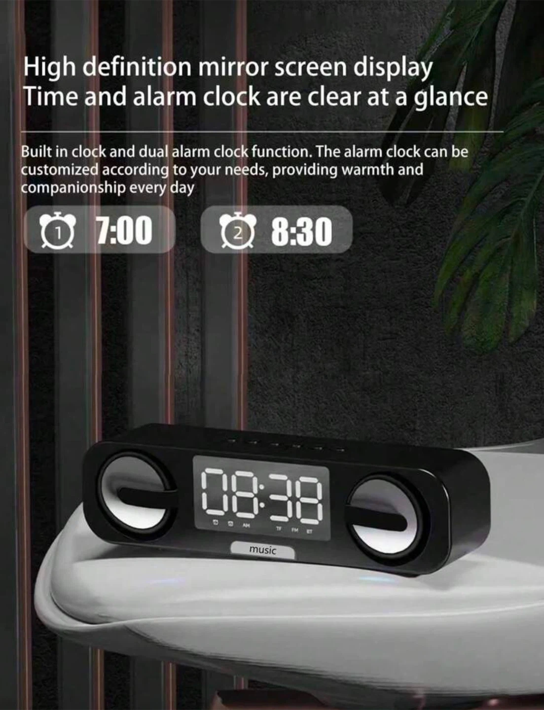 Enjoy high-quality sound with this Bluetooth 5.0 speaker! It features a full frequency speaker for better sound quality and 4D stereo high volume for a cinema-level experience. It also has a high-definition mirror clock display and a dual alarm clock function. It can be connected via Bluetooth or wired, with a wireless transmission distance of about 15 meters. It also supports TF card and USB play, and has an AUX audio connection