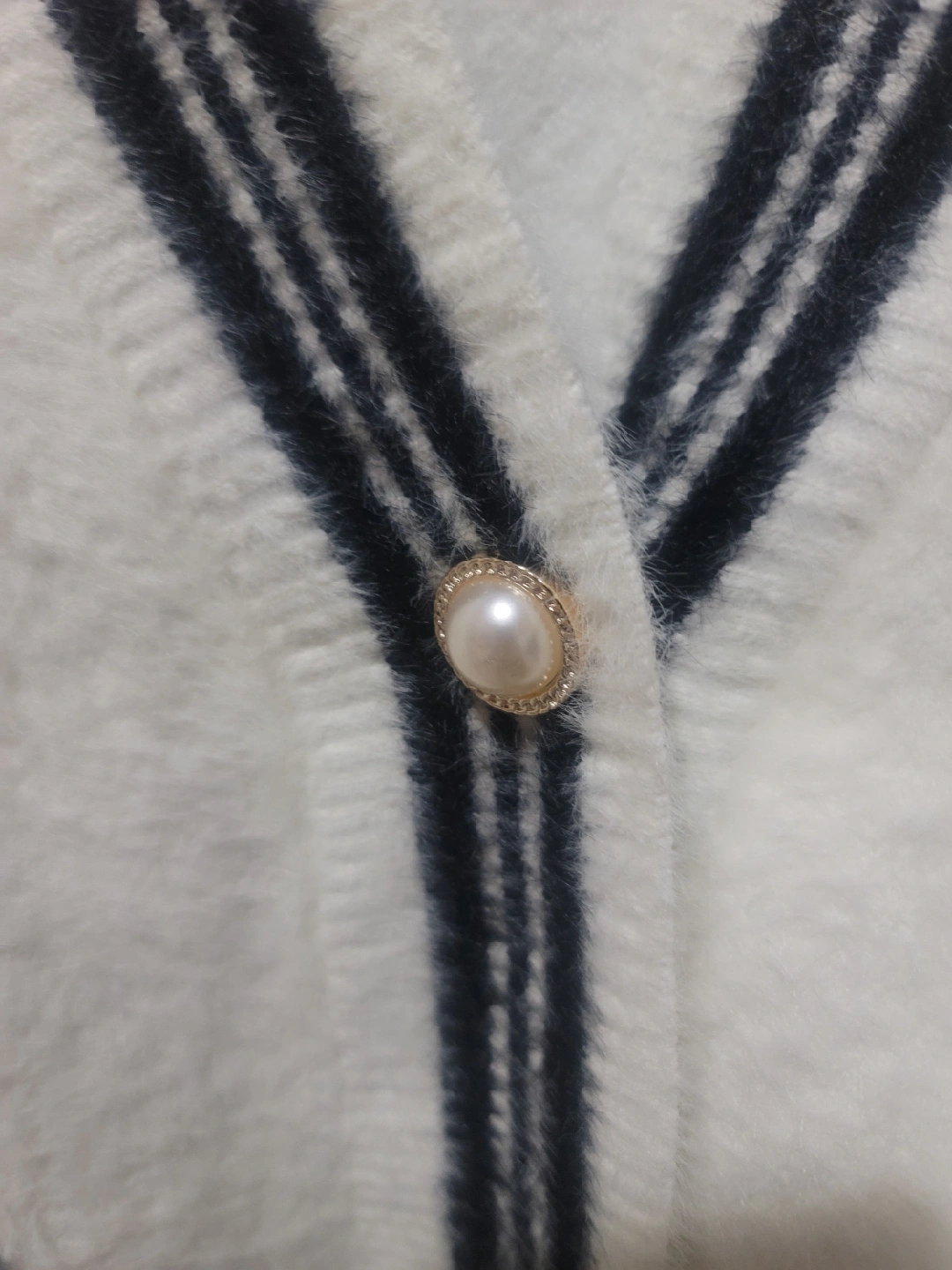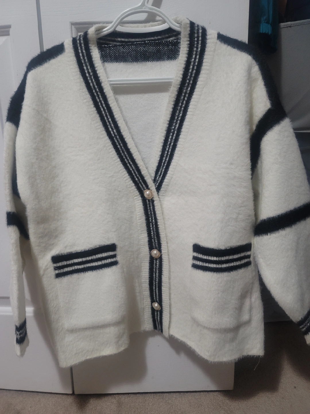 Selling a cozy white cardigan with black stripes. It has a classic V-neck and pearl-like buttons. Perfect for layering on cooler days!