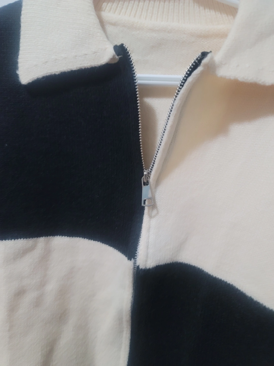 Here's a stylish striped zip-up sweater! It's a cream and black colour. Perfect for layering or wearing on its own