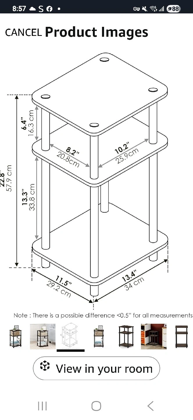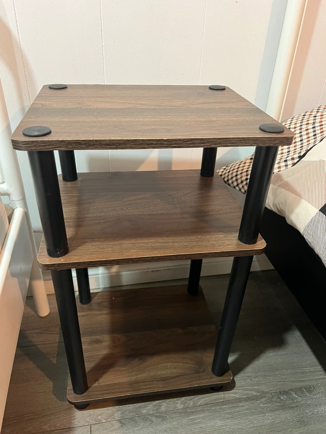 Selling a brown 3-tier side table. It's perfect for small spaces and adds a touch of rustic charm to any room. Great for holding books, lamps, or decor items!