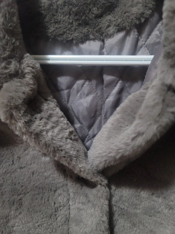 Here's a cozy faux fur jacket in a lovely grey colour! It's perfect for adding a touch of warmth and style to your outfit. The jacket features a soft, plush texture that feels great against the skin