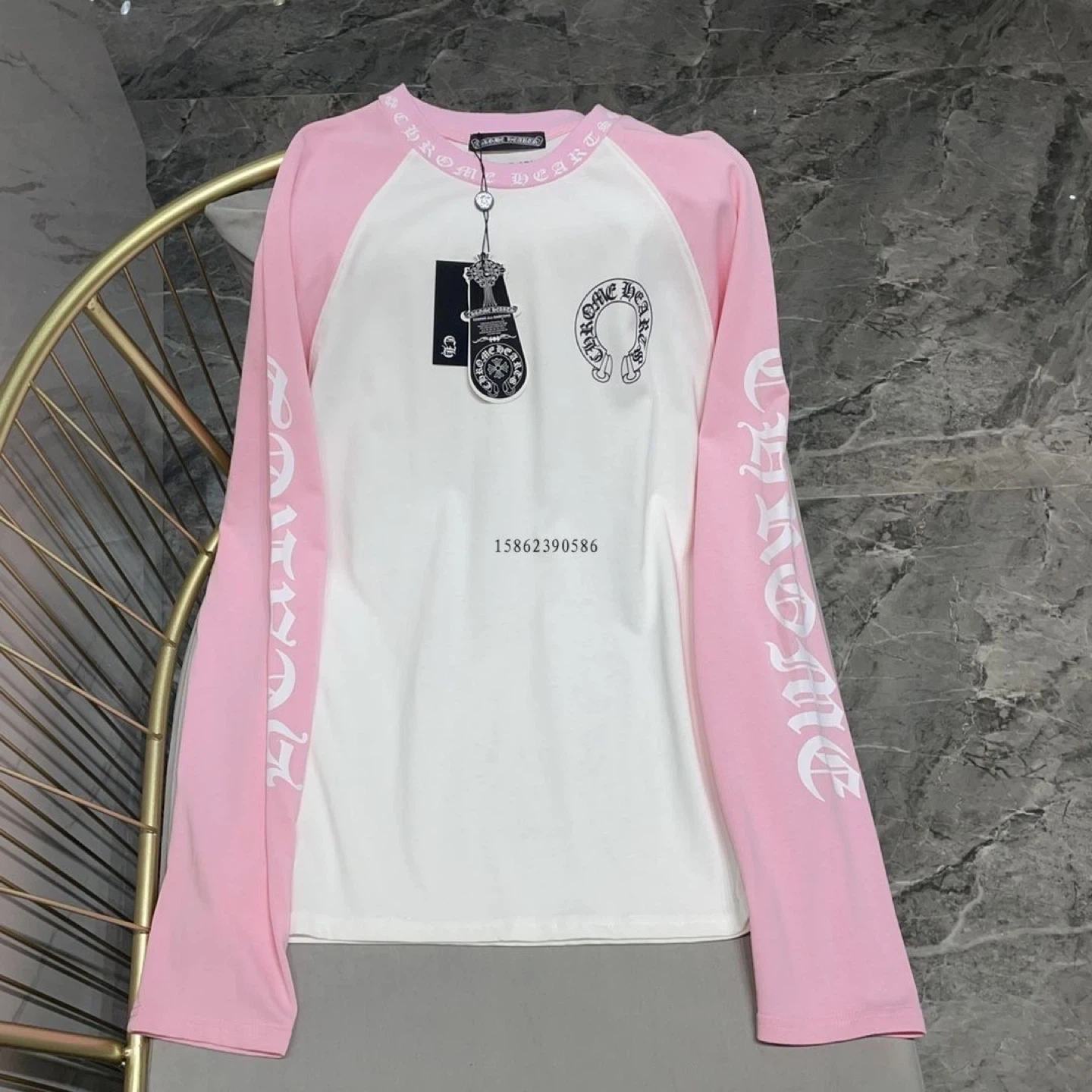 Selling a Chrome Hearts raglan long sleeve shirt! It features the iconic Chrome Hearts logo on the front and down the sleeves. The shirt is in great condition and has a stylish, unique look. Perfect for adding some edge to your wardrobe