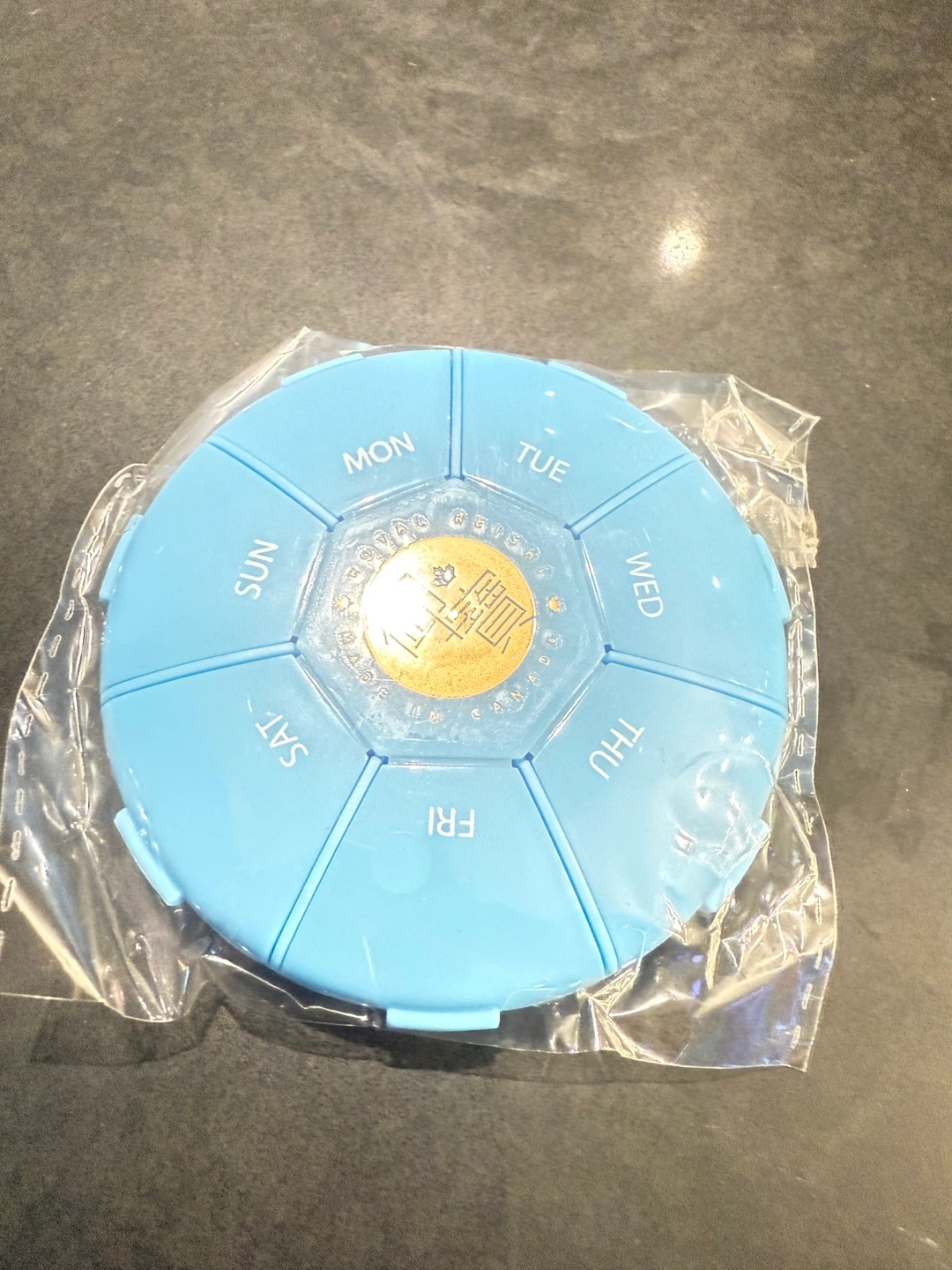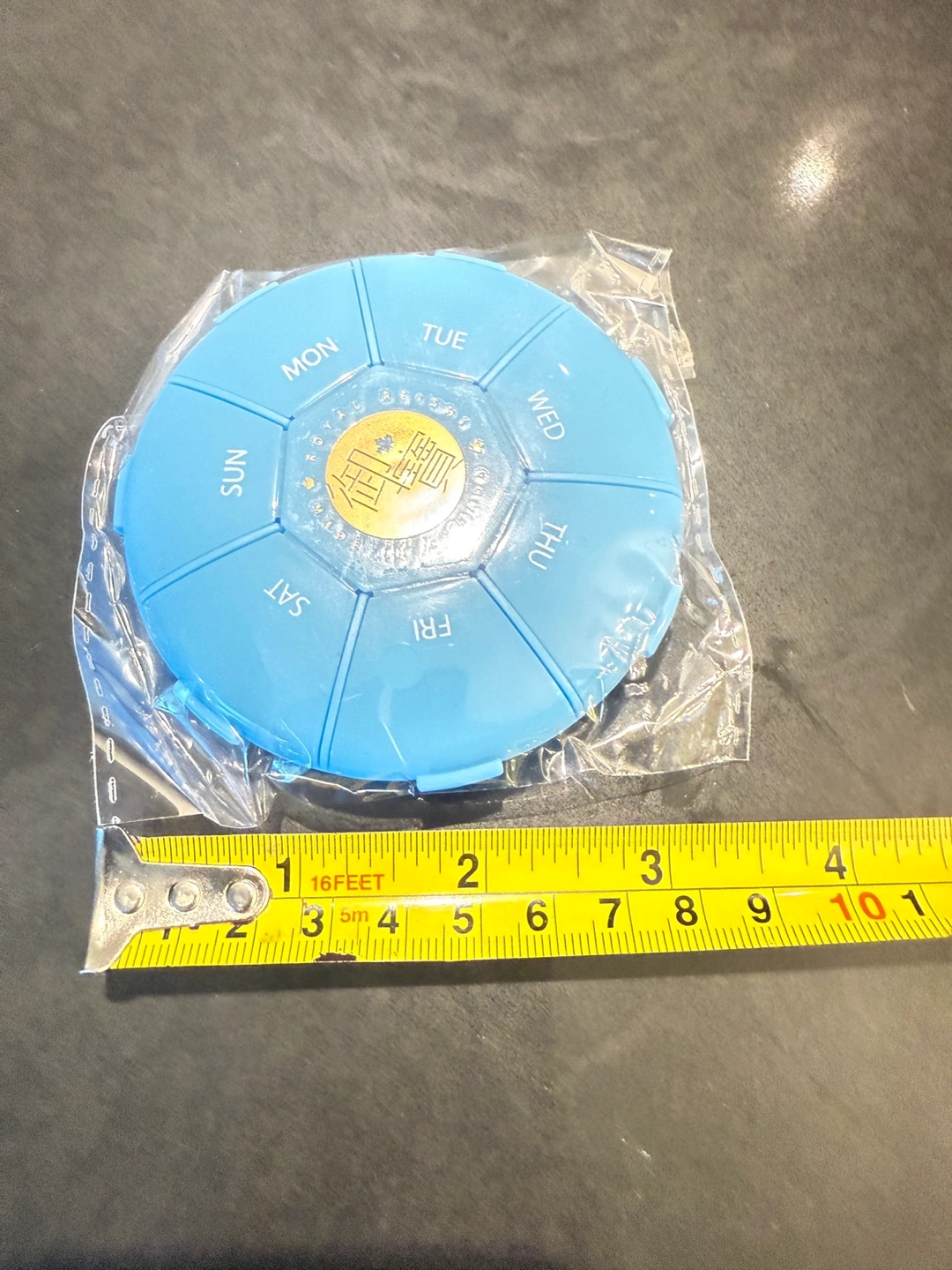 Here's a handy blue pill organizer, perfect for keeping your daily meds sorted! It has compartments for each day of the week. It's about 4 inches across.