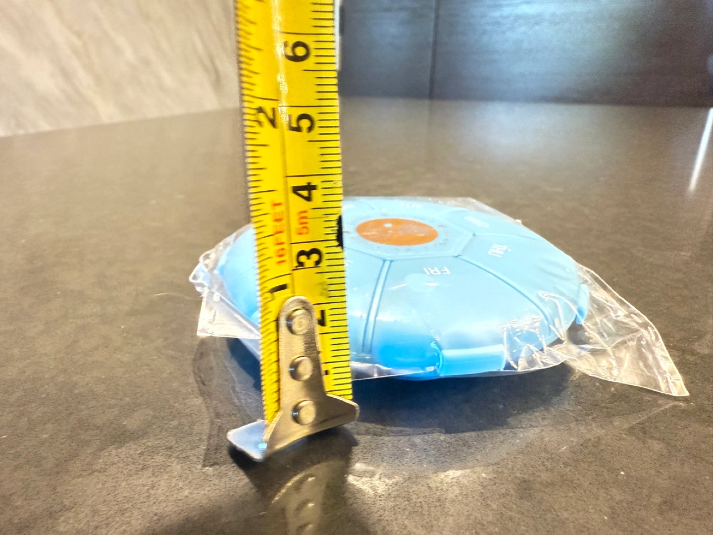 Here's a handy blue pill organizer, perfect for keeping your daily meds sorted! It has compartments for each day of the week. It's about 4 inches across.